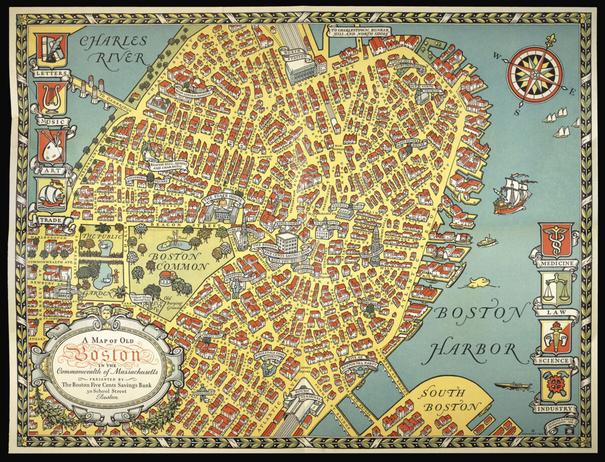 Detailed pictorial map of Boston in the style of Max Gill, highlighting major landmarks, from the centrally placed Boston Five Cents Savings Bank, to the burial place of Washington's portrait painter Gilbert Stuart. Issued to promote the bank: "Dear Old Boston – Those of us who have lived and worked here all or lives like to think of it in that way. We love Boston as we love a friend who has been loyal and helpful throughout the years, or a house that has been our home, she...