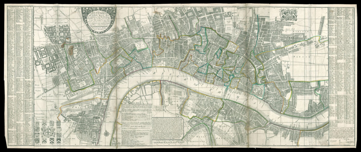 and Suburbs thereof, With the addition of the New Buildings, Churches &c. to this present Year 1734 (Not extant in any other,) Laid down in such a method that in an Instant, may easily be found any Place contain'd therein.