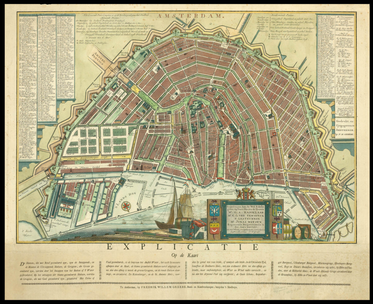 Very scarce plan of Amsterdam, here complete with the separate "explicatie" to the plan pasted outside the lower border, by Philips Jacobs in 1766, and dedicated to the burgomasters of 1765.