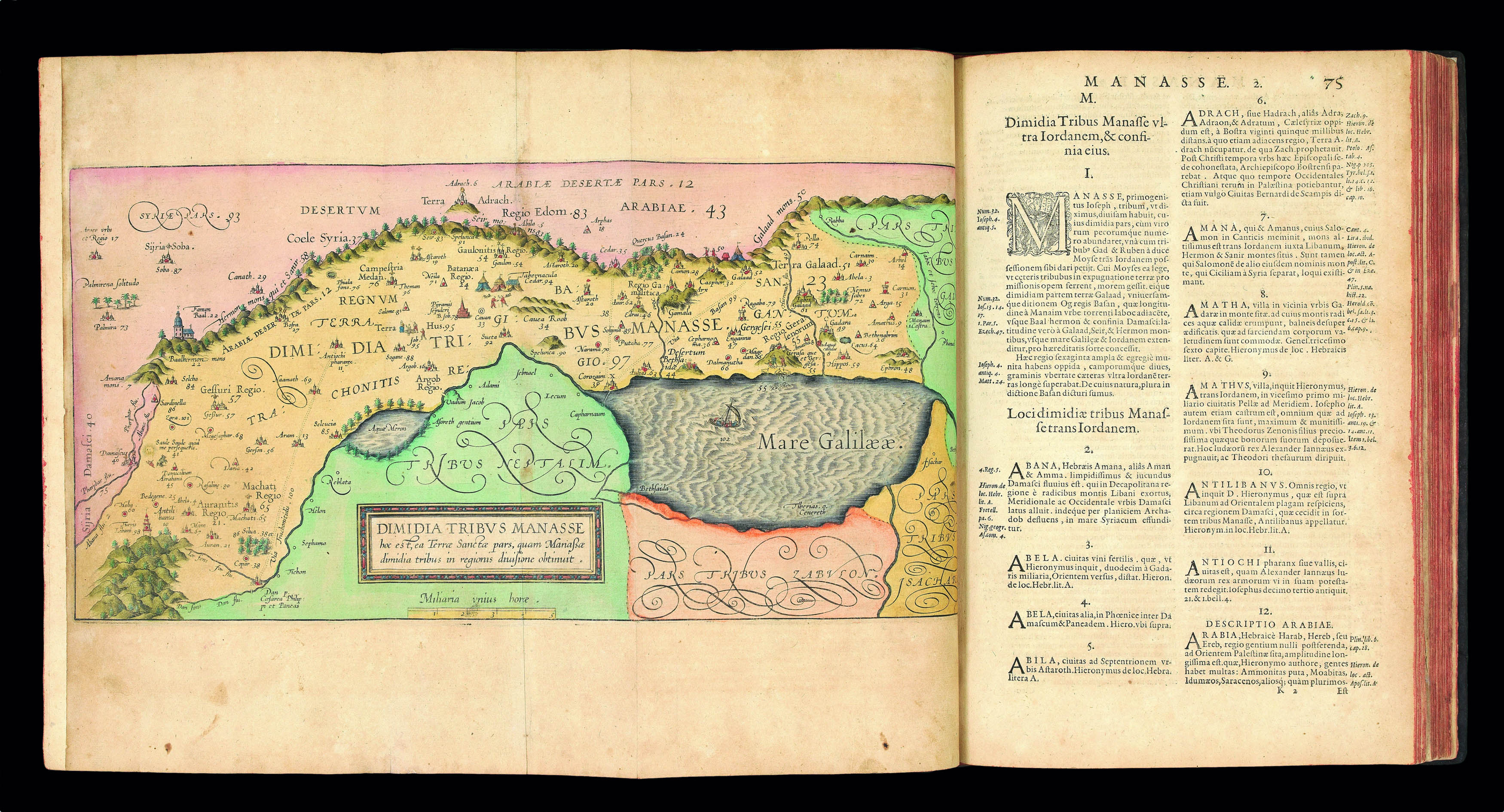 An exceptional example of the first edition of Adrichom's description of the Holy Land, rarely found with the iconic plates in contemporary hand-colour, including the impressive and important panorama of the Promised Land: 'Situs terrae promissionis ss bibliorum intelligentiam exacte aperiens…' extending to four feet in length; and a large and detailed plan 'Jerusalem et suburbia eius…', which Nebenzahl describes as the "most dramatic and important of the sixteenth century"...