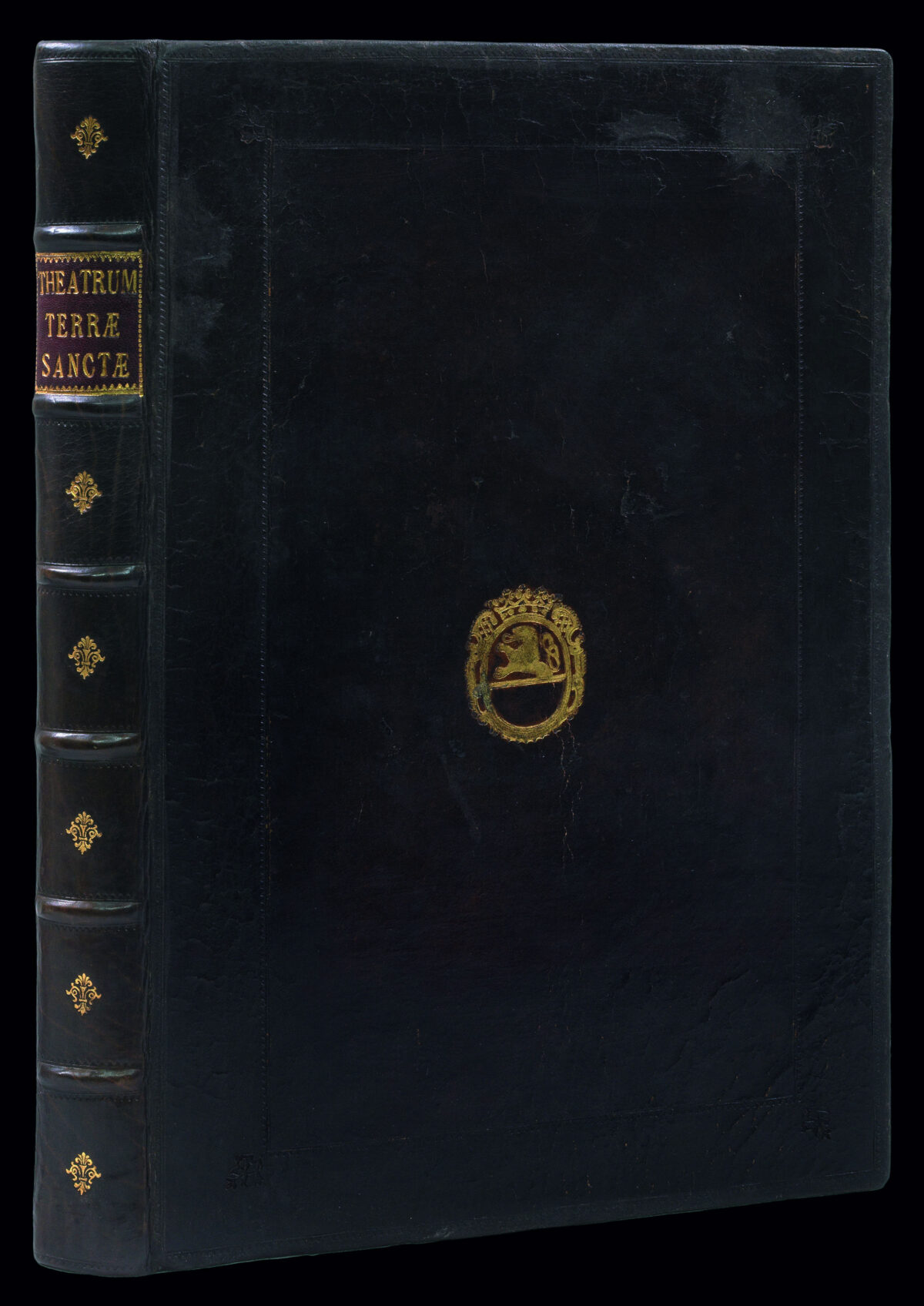 First edition. Folio (352 by 232mm). Latin text. Six leaves: elaborate engraved allegorical title-page with magnificent contemporary hand-colour in full, dedication to Octavius Pallavinci, preface; "Terrae Promissionis…" pages numbered 1-286; 14 leaves: catalogue and index (one or two closed marginal tears); fine folding panorama of the Promised Land (1200 by 350mm) on two sheets, large folding plan of Jerusalem (540 by 750mm) on two sheets (lower margin extended, separations at folds strengthened on verso with Japanese tissue) and 10 double-page and or folding maps of the lands of the Twelve Tribes, all with magnificent contemporary hand-colour in full. Seventeenth century blind panelled calf, each cover decorated with gilt armorial stamp (rebacked to style, board edges strengthened).