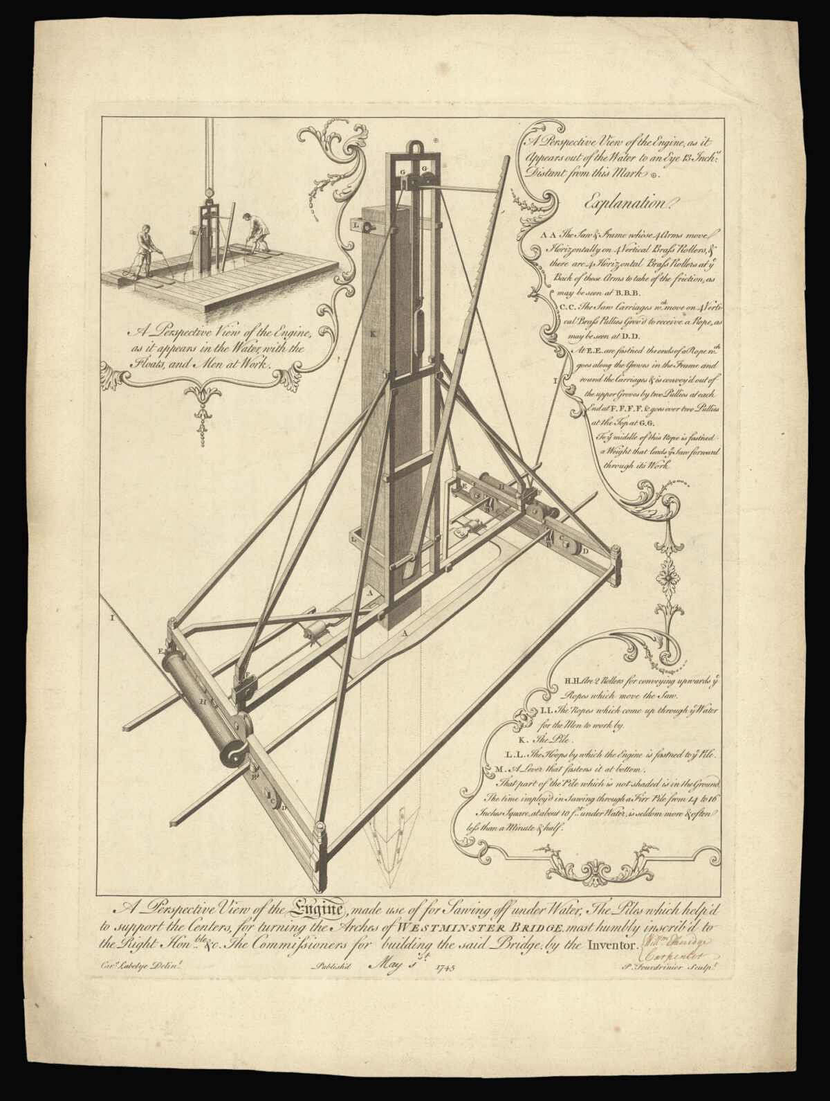 A Perspective View of the Engine, made use of for Sawing off under Water, The Piles which help'd to support the Centers, for turning the Arches of Westminster Bridge