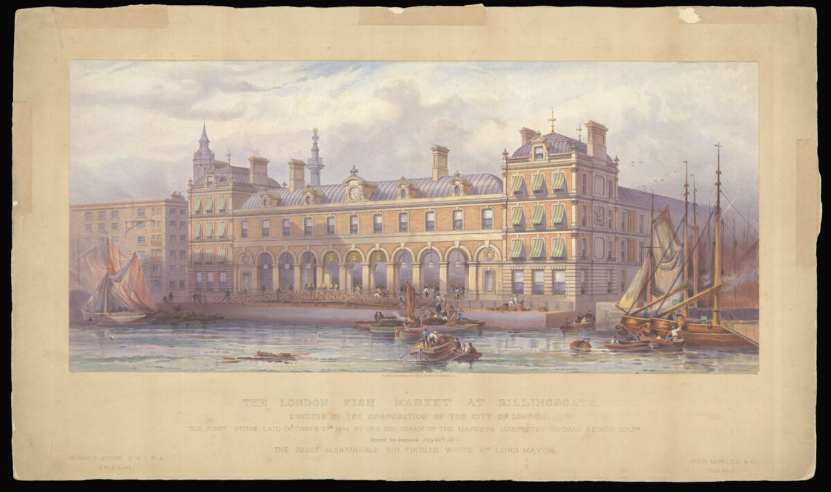 A view of Billingsgate Fish Market, in its original location in Billingsgate Wharf, in Lower Thames Street. The market had existed informally since the sixteenth century, but an official building was put in place in 1850. The market quickly outgrew it, and a new building was designed by Sir Horace Jones, who also designed Tower Bridge. The market was built to incorporate a riverside landing, so that fishermen could unload their produce directly into the building. As the cap...