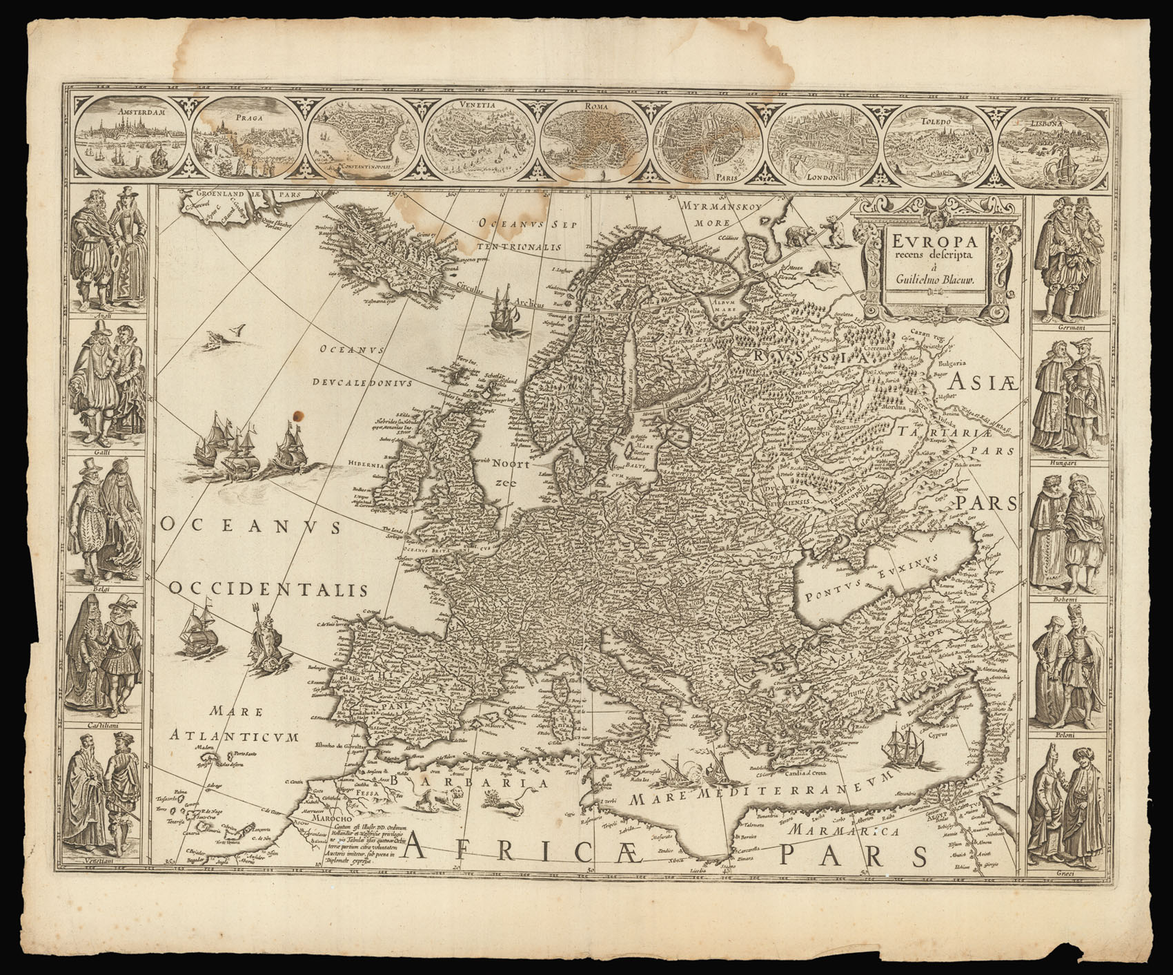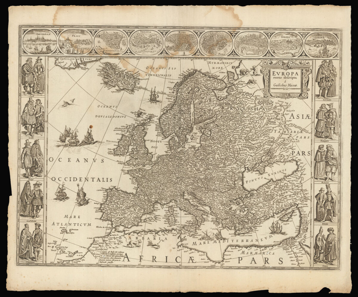 The map is a reduction of Blaeu's wall map of 1608, with the majority of the coastal cartography based on Blaeu's sea charts. A decorative border surrounds three sides: above are nine birds-eye' views of the principal European cities including Paris, London, Amsterdam, and Istanbul; flanking the map are ten costumed figures representing the national dress of various European inhabitants.