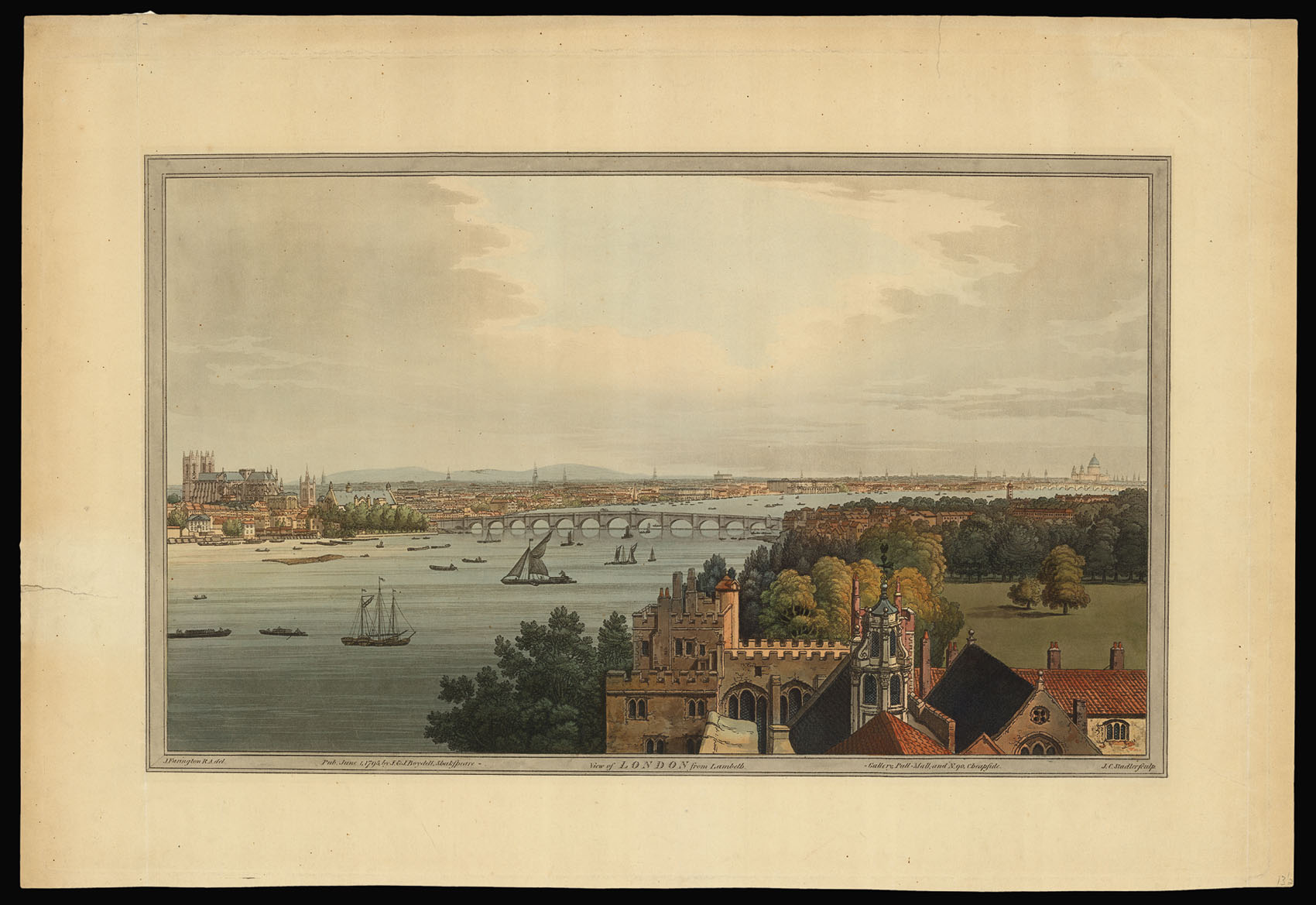 A view from St Mary Lambeth's tower looking across the Thames to Westminster Abbey, and up the river to the City of London. Westminster Bridge is in the centre, and Lambeth Palace, seat of the Archbishop of Canterbury, to the right.