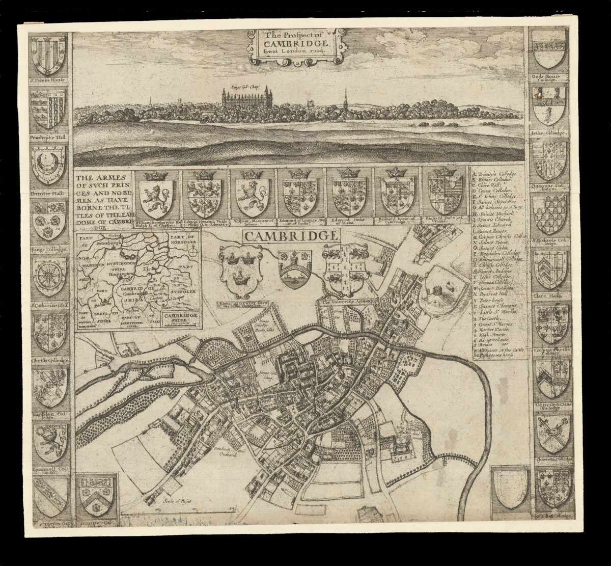 In the upper left-hand corner is a map of Cambridgeshire, with parts of the surrounding counties of Norfolk, Suffolk, Essex, Bedfordshire, Hertfordshire and Northamptonshire also shown. Along the upper border of the main view are also "the armes of such princes and noblemen as have borne the titles of the earldome of Cambridge", as well as the University Arms and a shield showing St. John's College's famous New Bridge, now commonly known as the Bridge of Sighs. In the left- and right-hand margins of the print there are twenty coats of arms for the different colleges. Above the main image is a "prospect of Cambridge from London Road" in which the turrets of several prominent buildings include King's Chapel and St. Mary's Church are depicted against a backdrop of rolling fields.
