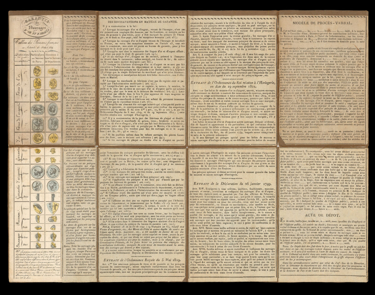 A guide for goldsmiths, silversmiths, jewellers, and watchmakers in France, explaining the system of hallmarking implemented in 1819, with a map illustrating regional hallmarks.