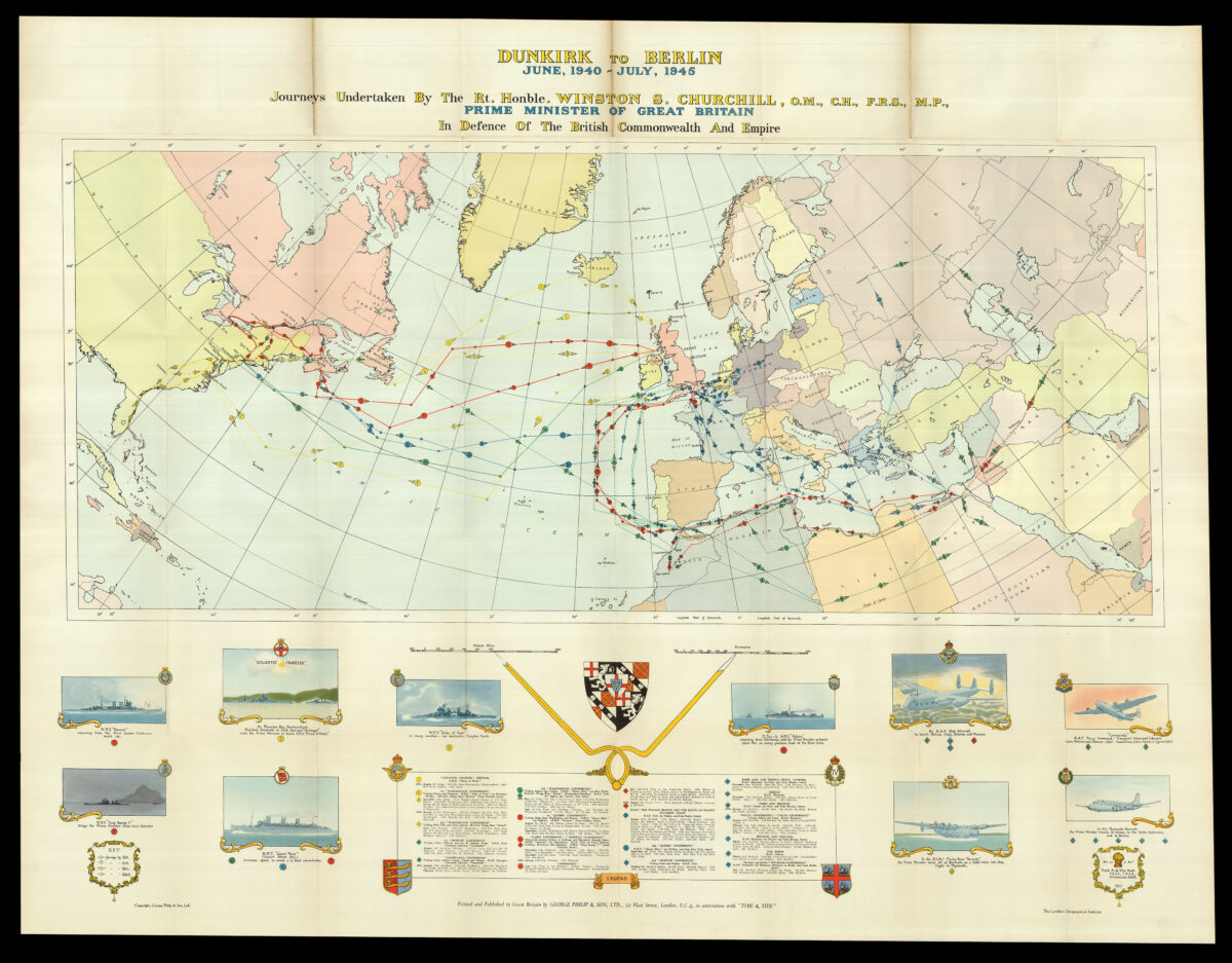 Unusual map charting 19 different journeys undertaken by Churchill over the course of the Second World War, including his trips to the "Atlantic Charter" Meeting, the Normandy beaches, and the Yalta and Potsdam conferences. Each journey is numbered, corresponding to a legend at the bottom-centre, which details information as to the route and dates of the trip. A key bottom-left explains the symbols that denote whether a journey was made by sea, air, rail, or road. Also at t...