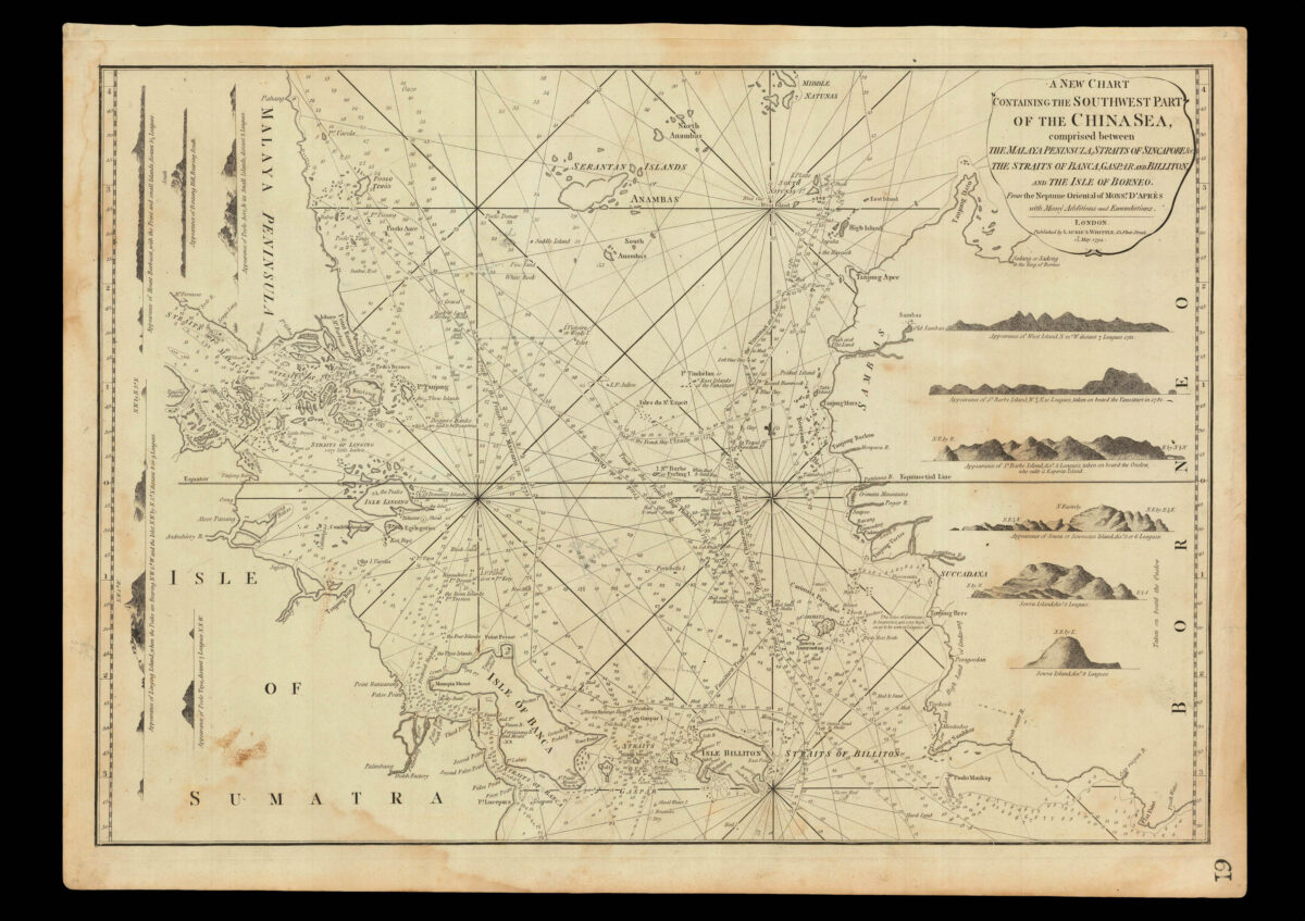 Based on D'Apres Mannevillette's 'Carte de la partie comprise entre la Sortie du Detroit de Malac le Detroit de Banca e l'Isle Borneo...' (1775), the chart is vastly more detailed, particularly i...