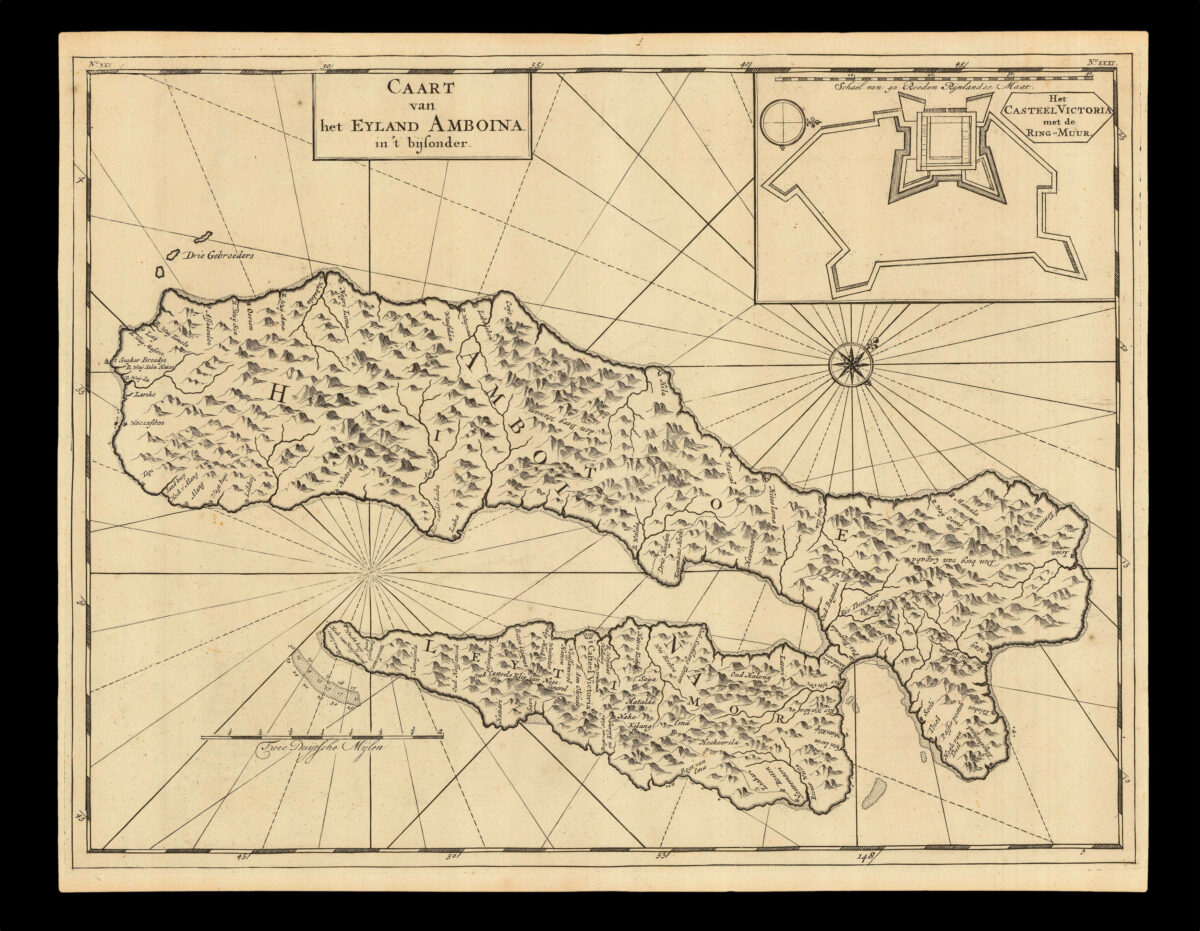 The important Dutch controlled island Ambon, with an inset of "Het Casteel Victoria met de Ring - Muur", which accompanied Rumphius's lost manuscript 'Amboinsch Dierboek', published in Valentyn's 'Oud en Nieuw Oost-Indien, vervattende een Naaukeurige en Uitvoerige Verhandelinge van Nederlands Mogentheyd in die Gewesten', two volumes, an account of the history of the Dutch empire in Asia.