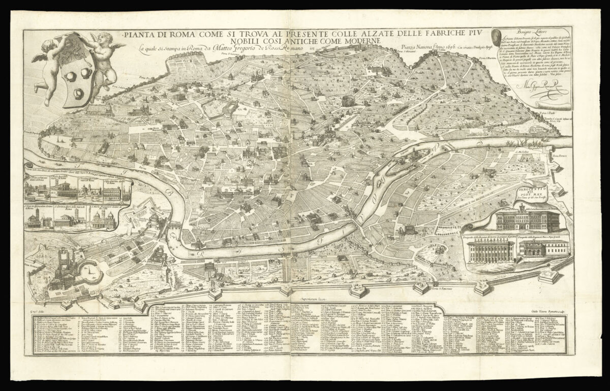Plan of Rome on printed from two etched copperplates on two full Royal sheets joined, 497 x 837mm. Dedication in scrolled cartouche, arms of the dedicatee, pope Alexander VII (Fabio Chigi della Rovere) supported by putti, principal features shown in perspective, seventeenth-century fortifications shown, key in cartouche along lower margin, scalebar with dividers in the hand of God. (Trimmed to plate mark, small ink stain affecting border of key cartouche only, strengthened ...