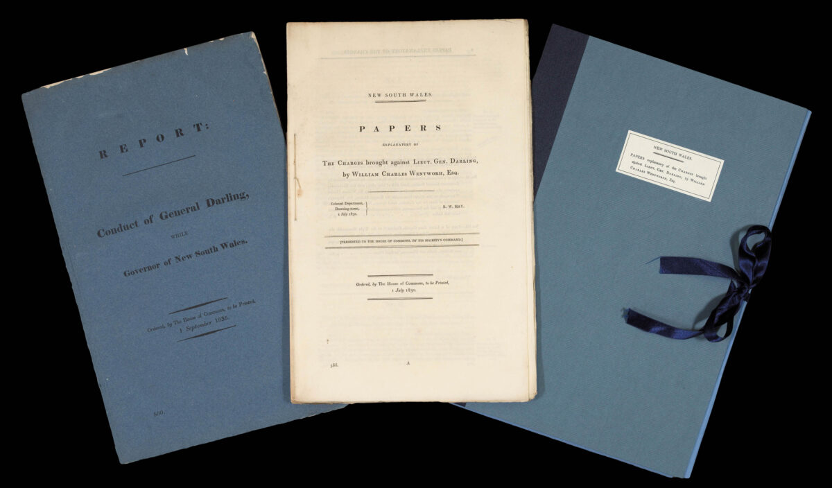 Comprising - 'New South Wales. Papers explanatory of the Charges brought against Lieut. Gen. Darling, by William Charles Wentworth, Esq.' London, Ordered, by the House of Commons, to be printed, 1 July 1830. Number 586 - 'Report from Select Committee on the Conduct of General Darling, while Governor of New South Wales. With the Minutes of Evidence and Appendix'. London, Ordered, by the House of Commons, to be printed, 1 September 1835. Number 580 Official parliamentary papers, recording a biased account of the famous case brought by William Wentworth, an early proponent for Australian self-government, against the then Governor, Sir Ralph Darling, but essential, only offering Darling's defence, and not Wentworth's. The young William Wentworth (1790-1872), led a peripatetic youth. However, his "adventurous spirit, drought, and the desire to discover new pastures led him in May 1813, in company with William Lawson, Gregory Blaxland, four servants, four horses, and five dogs, to take part in the first great feat of inland exploration, the crossing of the Blue Mountains". The ease with which they accomplished their mission, which established a stock route, gave impetus to great pastoral expansion. Passionate about Australia, in 1819, Wentworth published 'A Statistical, Historical, and Political Description of the Colony of New South Wales and Its Dependent Settlements in Van Diemen's Land, With a Particular Enumeration of the Advantages Which These Colonies Offer for Emigration and Their Superiority in Many Respects Over Those Possessed by the United States of America'. His book did stimulate emigration, and was reissued in revised and enlarged editions in 1820 and 1824. Intent on achieving freedom of the press, trial by jury, and taxation by consent, in the colony of New South Wales, the third edition of the vehemently attacked the report of Commissioner Bigge, who had been censorious of Governor Macquarie's emancipist policies and fair dealings. In 1826, Wentworth seized on the death of a Private Suggs, in custody, as a pretext for attacking the autocratic government of Governor Ralph Darling (1772-1858). He alleged the illegality of Darling's act, and demanded his recall to England. The affair rapidly developed into a bitter feud, and the resulting cases occupied the Supreme Court through 1828 and 1829. All of which is recorded in these papers. Eventually, Darling served out his tenure and departed for England in 1831. By taking up the "fight against autocracy and by his imperious courage and oratory in the defence of emancipists at the Bar Wentworth had awakened a political instinct among the smaller people of Sydney and become their hero. He had touched both journalism and the Bar with the fire of his brilliance and given them definition, direction, and the vision of greatness: he may justly be called their prophet in the Australian nation, if not the prophet of that nation itself. The larger fight remained: for the great goal of self-government. But, even as the people of Sydney were flocking out to Vaucluse to join with the popular hero in celebration of the tyrant's departure, changes in Wentworth's own life and activities were beginning to cause disillusion among many who only partially understood his aims. With the swelling tide of immigration into New South Wales, the exclusive-emancipist issue was receding into the background of politics. So fast were events moving that in 1835, when Darling was cleared of Wentworth's charges and knighted, there were few in Sydney who showed concern" (Persse).