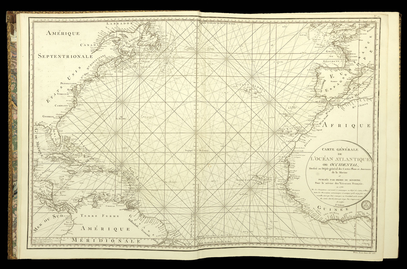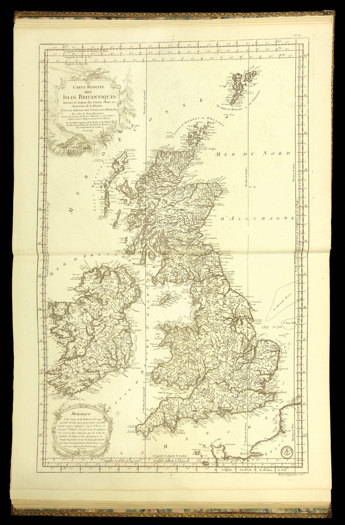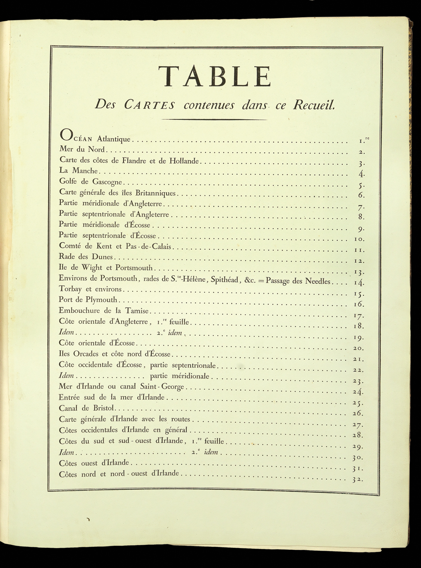 As with the Neptune Francois, this volume was made up from the charts available to the French Admiralty. They range in date over half a century, from those compiled by J.-N. Bellin to the charts of England's south coast harbours, prepared for Napoleon. There are two general charts of the North Atlantic followed by detailed charts covering the whole of the British Isles (particularly places of strategic importance such as the Isle of Wight, Portsmouth, Torbay and Plymouth).