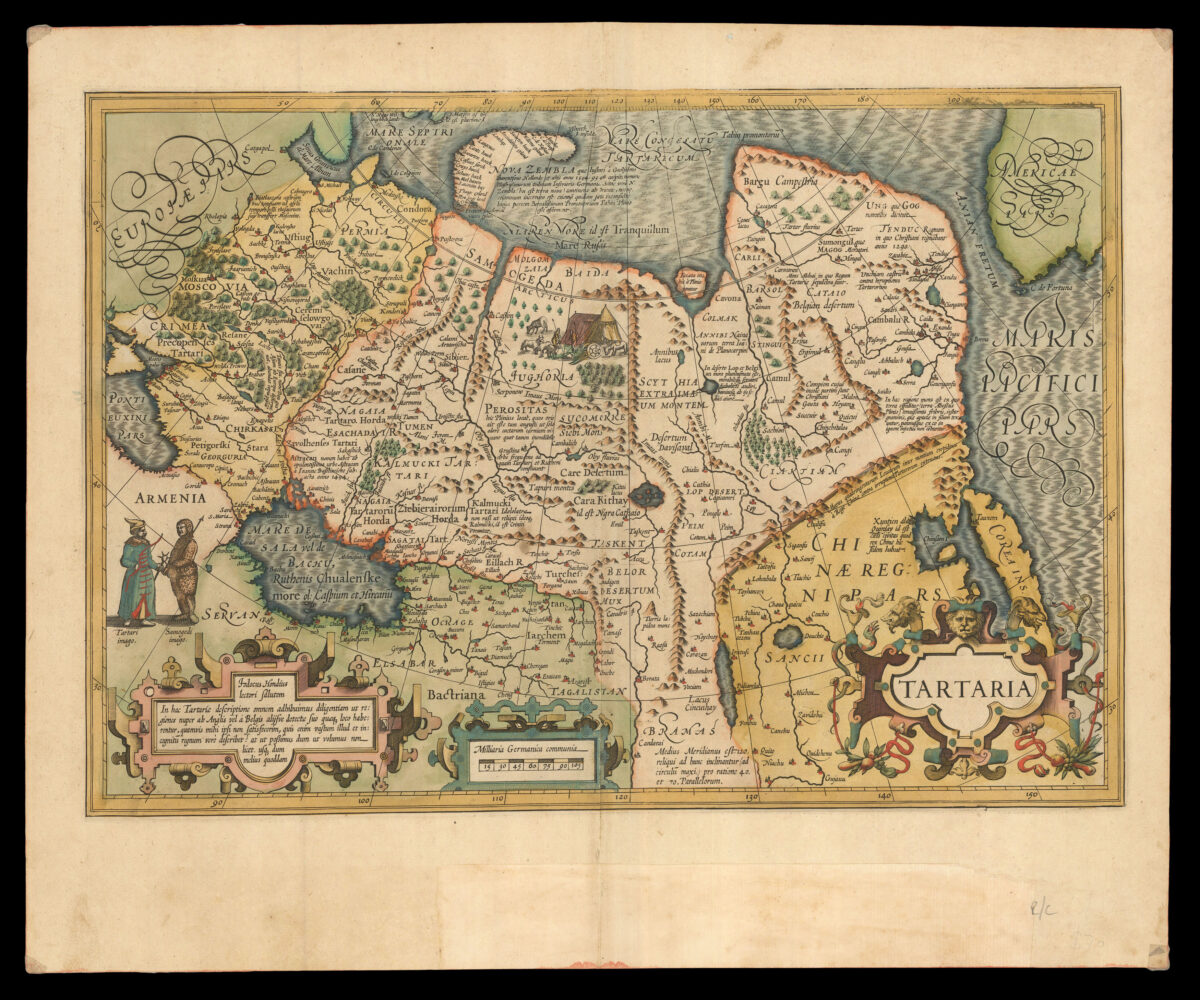 Ostensibly, a map of Tartary, or the Realms of the Great Khan, based on Abraham Ortelius's map of 1570, the map records the dramatic change in economic and national dynamics that came over a century, from the traditional use of the Silk Road to convey goods from Cathay and the East to opening of a sea route via South Africa in 1498 to bypass Islamic / Italian control of the traditional routes. The Portuguese directly controlled this route to India and, through a series of f...