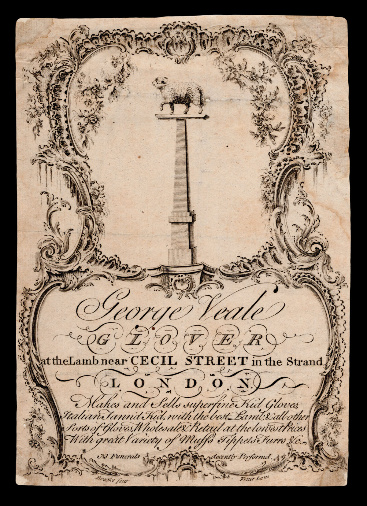 On his trade card, George Veale advertises that he "Makes and Sells superfine Kid Gloves, Italian Tann'd Kid, with the best Lamb & all other Sorts of Gloves, Wholesale & Retail at the lowest Prices With great Variety of Muffs. Tippets Furrs &c. NB. Funeral decently Performed". An ornate frame surrounds the text and the illustration, which shows a lamb on a high pedestal, in reference to Veale's address "at the Lamb near Cecil Street in the Strand".
