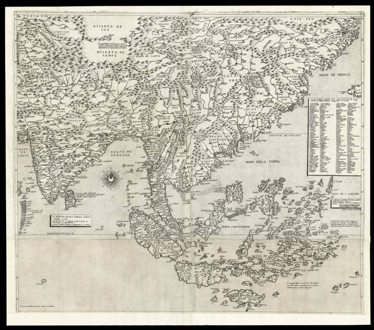 The map extends from central Asia to China and is particularly important for its depiction of the islands below the Equator. Alongside the Moluccas, labelled the "Isole di Ambon", Gastaldi includes a note explaining that "in these islands there are cloves, cinnamon, nutmeg, pepper, sandalwood, ambergris, and many spices" (transl.), reflecting the importance of these resources to Venetian trade. e Philippines appear as "Philippina" and Borneo in its present nomenclature; found below these is Java, labelled "Giava Magiore" to distinguish it from the fictitious "Giava Minore" added by Forlani. Significantly, this is the first map to name Singapore and Cambodia.