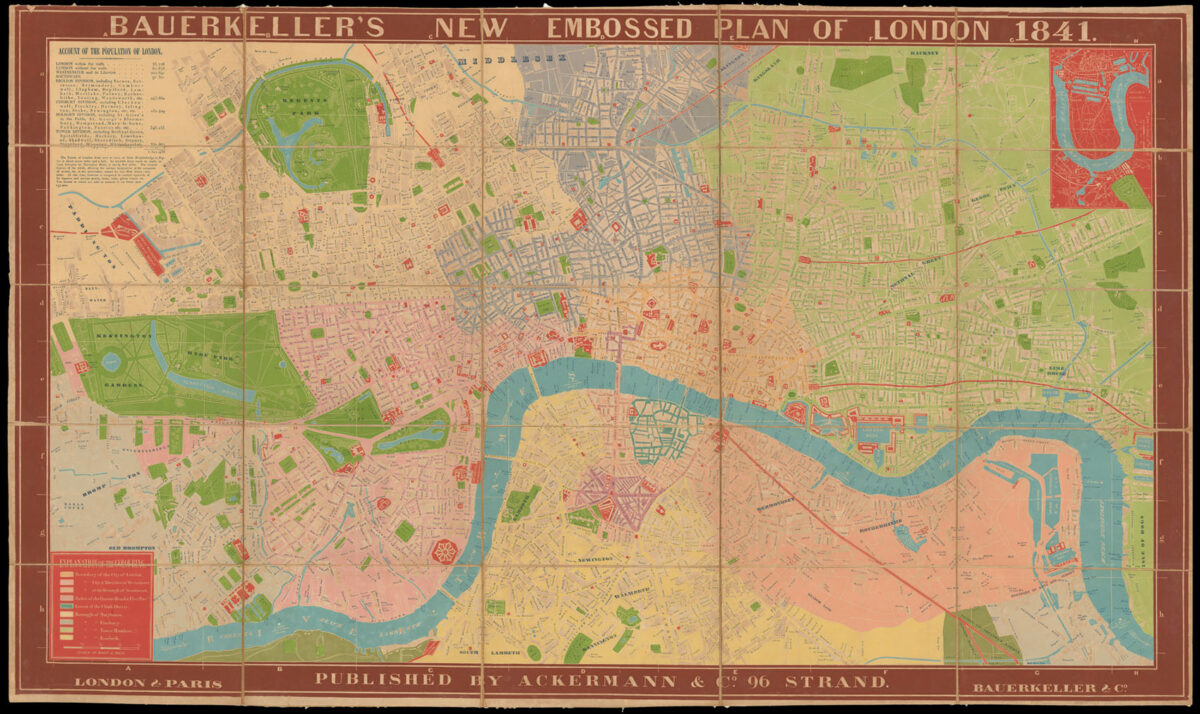 This extraordinary embossed plan shows each locality in a different colour and built up areas raised in white, similar to the technique of Braille. Extending from Islington in the north to Kennington in the south and from Kensington High Street in the west to the West India Docks, with an inset of Greenwich at a smaller scale. A unique style of cartography in very good condition.