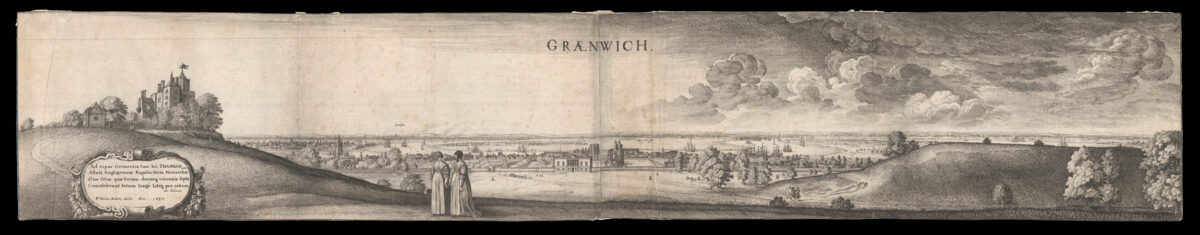 Hollar's panoramic view of Greenwich encompasses many of the features that made the seventeenth century town an important location, from Greenwich Palace to the buildings of the City of London visible in the background. From the top of a hill, the Thames can be seen extending into the distance, small and large vessels alike on its waters, while the nearby land is taken up by fields and buildings alike. Large clouds loom overhead and two female figures stand on the hillside. ??Just to their left is an ornate cartouche containing the dedication to Queen Henrietta Maria, wife of Charles I, although the text was changed in later editions.