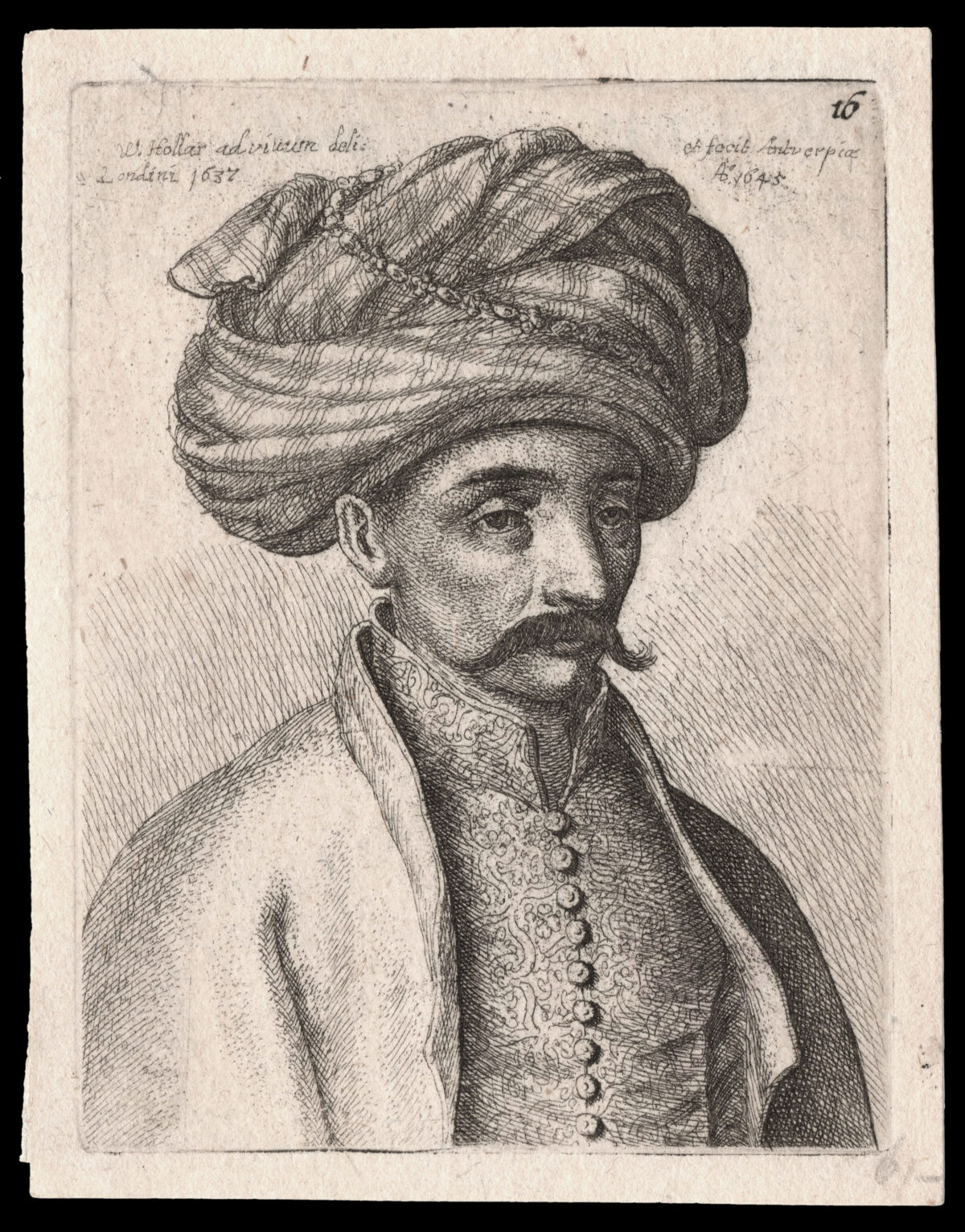 In 1645, after his escape from the Parliamentary forces that had captured him as part of the Royalist regiment and his return to Antwerp, Hollar published a portrait that he had drawn upon arriving in England in 1637. The image shows a moustached Turkish man wearing a large turban held in place by a jewelled chain, and a large jacket over an embroidered doublet. It is unclear whether the series of portraits drawn by Hollar in the late 1630s and published in 1645 are based o...