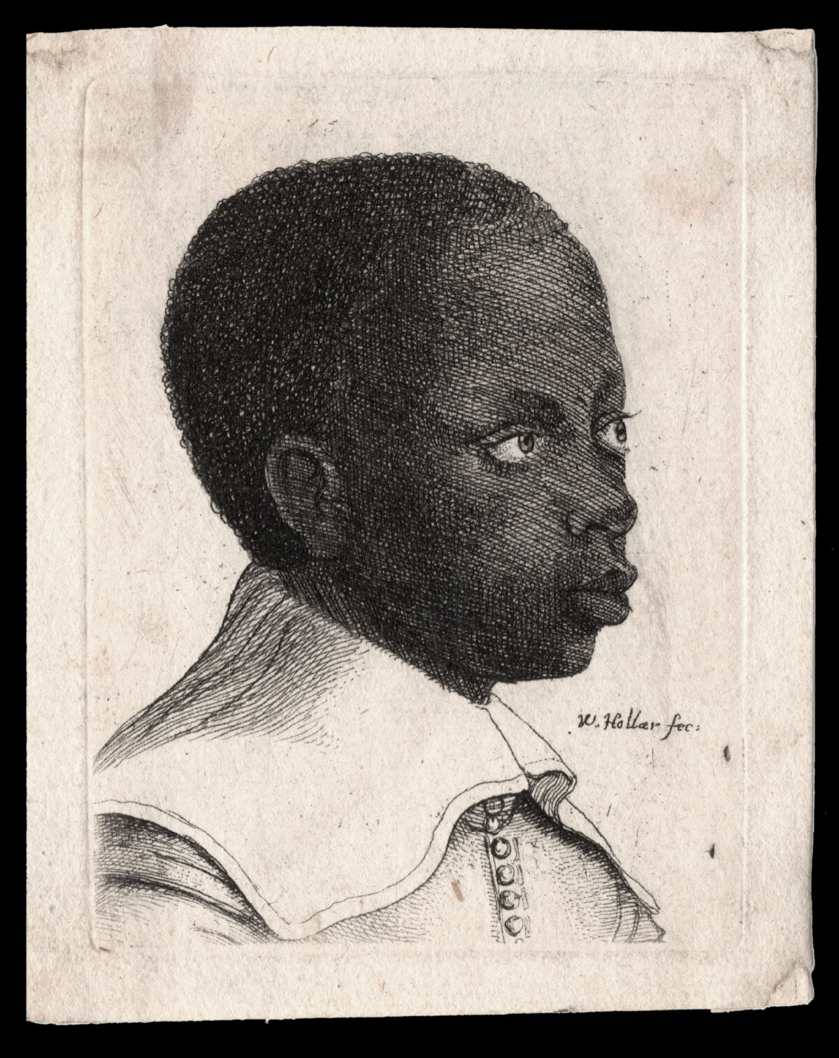 In 1645, after his escape from the Parliamentary forces that had captured him as part of the Royalist regiment and his return to Antwerp, Hollar published a number of portraits, the most remarkable of which show three diasporic African people. The present image shows an African boy in profile wearing a broad white collar, set in an oval frame; it is much the same as another portrait produced by Hollar at this time, but much of the facial detail lacks shading. Unfortunately ...