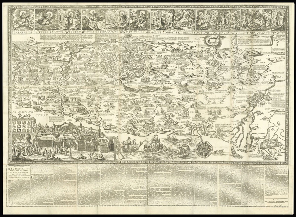 The map - orientated with east at the top - stretches from Sidon and Damascus in the north to Alexandria and Mecca in the south. As the title suggests numerous scenes from the Old and New Testament are depicted: from the Saul's conversion on the road to Damascus; Moses receiving the Ten Commandments on Mount Sinai; to the birth of Jesus Christ. To the lower left is a birdseye view of Jerusalem - after Visscher - with scenes of Christ's entrance into Jerusalem on Palm Sunday, the stoning of Stephen, and Christ driving the money lenders out of the temple. To the right upon the sea Jonah is being thrown from a vessel,with an expectant whale's mouth wide open. To the upper centre of the map is depicted ancient Jerusalem, with a key to the far right identifying 35 places of interest, including Herod's Palace, the Temple of Solomon, and the David's monument. To the extreme upper right beyond the Red Sea is "Meque" (Mecca); the legend to the right tells us that the town is the most magnificent town in Arabia where the Turks (Muslims) go on pilgrimage as they believe it to be the birth and burial place of Mohammed, were 3000 candles are constantly a light. Just above Mecca is dedicatory inscription by Jaillot and his imprint dated 1697.