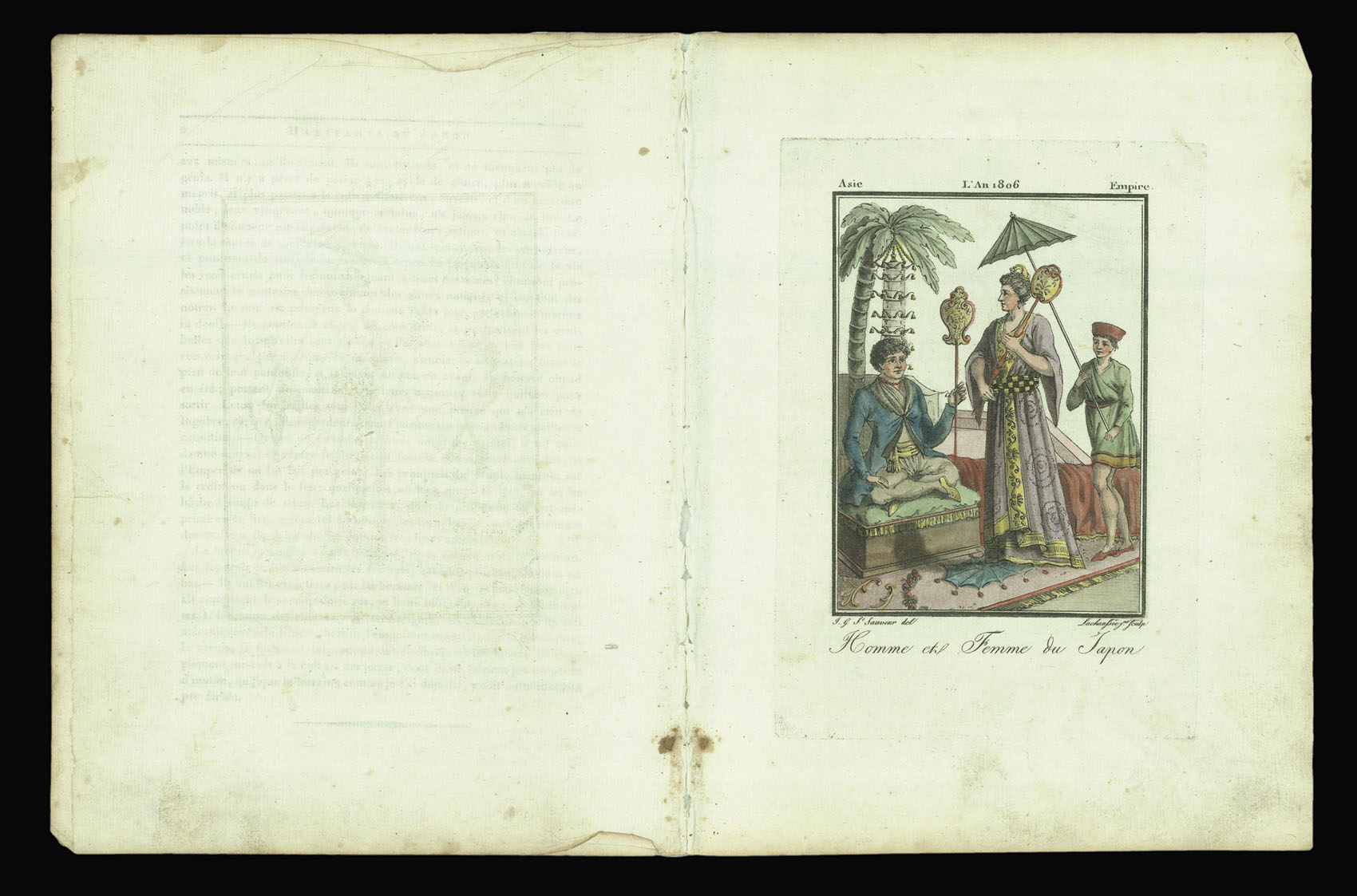 An engraved plate, showing the artist's idea of Japanese dress for a man and a woman; possibly from 'Voyage pittoresque dans les autres parties du monde', an 1806 travel work by St Saveur. ...