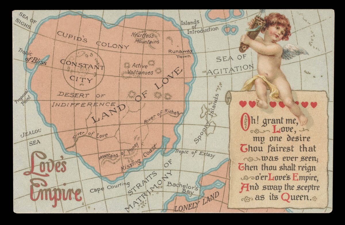 The Land of Love, to the left, is in the shape of a heart with 'Constant City' at its centre. To its south lie the rivers of 'Love' and 'Riches' and mountains of 'Money'. The lover should enjoy the 'kissing coast' and the tropics of 'Extasy' and 'Bliss', but try to avoid the 'Heartless Mountains' and 'Runaway Town'. If one is luck you could reach 'Proposal Point' and the 'Straits of Matrimony', all the while ma...
