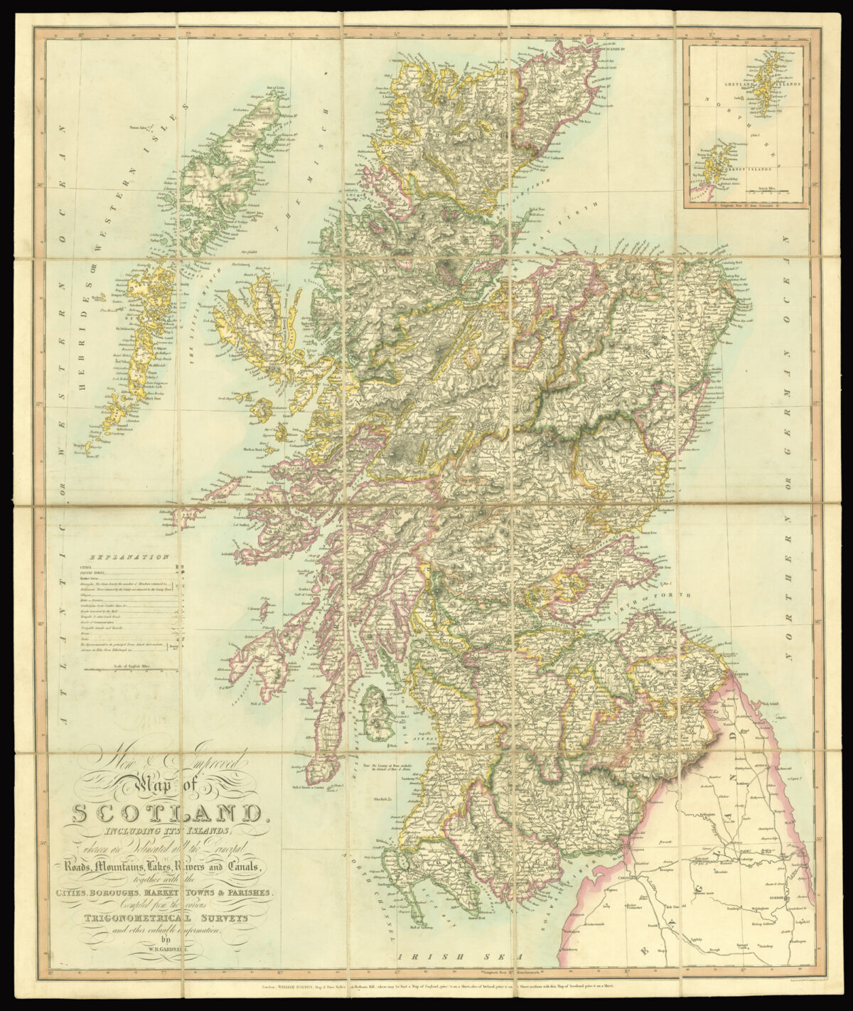 Hand-coloured engraved map, dissected and mounted on linen, inset map of the Shetland Islands, green marbled endpapers.