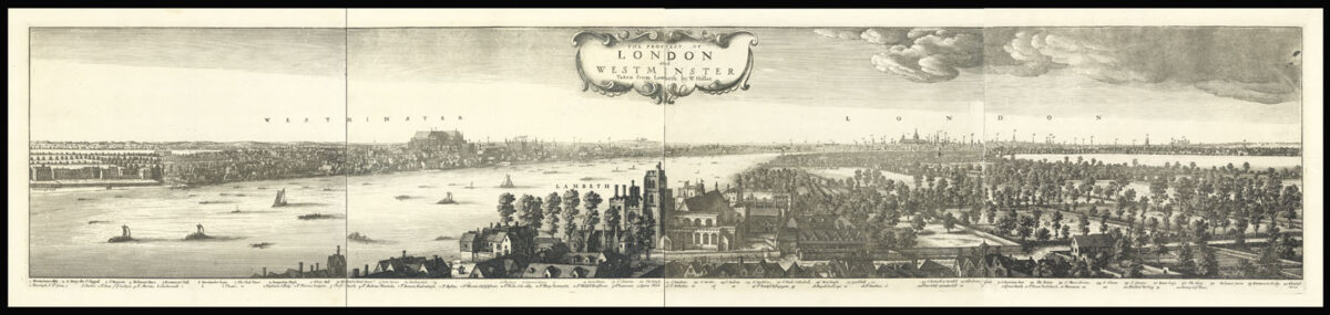 A post-Fire of London prospect by one of the most famous etchers of topography, Wenceslaus Hollar (1607-1677). The prospect shows the north bank of the Thames from Peterborough House in Fulham to St George's Allhallows Church in Barking. On the south bank Lambeth Palace fills the centre. The date of the original etching is unclear: it is likely that it was fairly close to Hollar's death in 1677, because most extant examples have reworking by another hand. This new engraving...