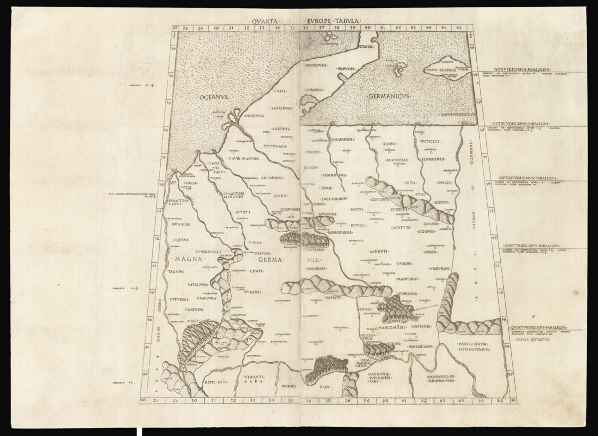 From the beautiful second Rome edition of Ptolemy's Geographia. "This handsome edition is a reprinting of the copper-plate maps of the 1478 Ptolemy [the first Rome edition by Conrad Sweynheym and Arnold Buckinck, whose] maps ...