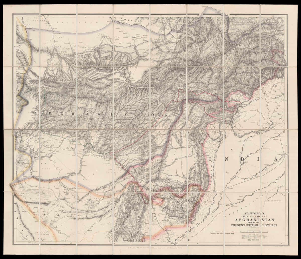 Stanford's map of Afghanistan, showing the border between Afghanistan and British India following the treaty of Gandamark.