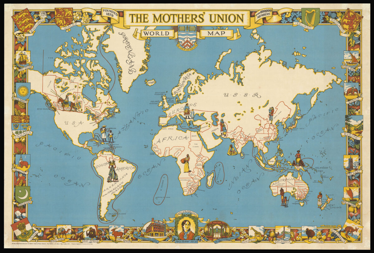 During the first half of the twentieth century, membership of the Mothers' Union soard from 169,000 in 1900 to half a million in 1950. Shortly after hitting the 600,000 members mark, the association produced a commemorative map showing their global presence. Made by map publisher Francis Chichester, the map highlights the expansion of the Mothers' Union across six continents, with red lines delineating areas where its branches were located. There appear to have been no members in the United States, Scandinavia and the U.S.S.R. 11 illustrations across the map depict native mothers, including an American Indian in southern Canada and an Aboriginal family in Australia.