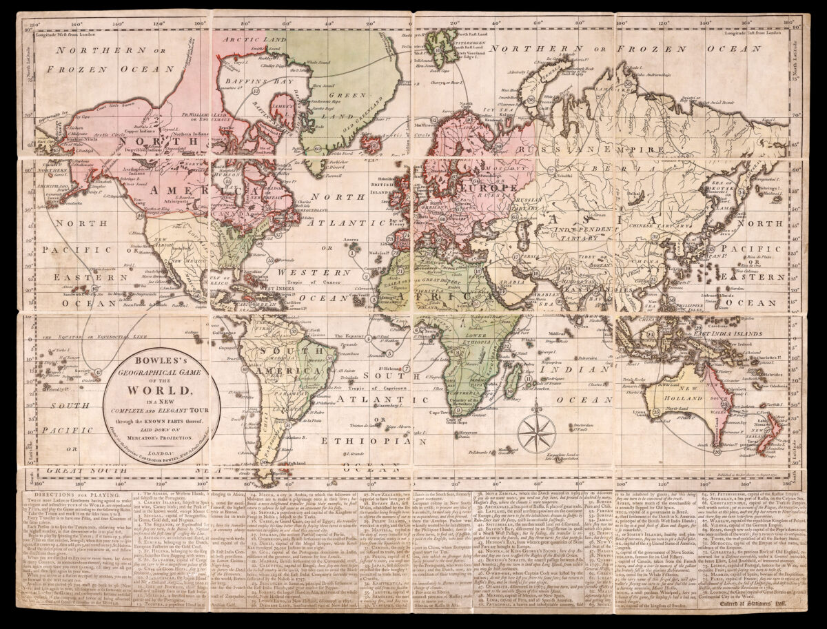 The game begins in the Azores, and heads down the west coast of Africa, passing St Helena, and the Cape of Good Hope were you "stay 3 turns to survey the Dutch Settlement", from there the player heads up the east coast and into the Red Sea to Mecea (Makkah or Mecca) "to which the followers of Mahomet are to make a pilgrimage once in their lives". The player leaves the Arabian Peninsula, journeying through Iran and into India, where one must stay a turn in Calcutta, the capital of Bengal, "to see the richest country in the world, but take care to avoid the Black hole". From here they head south to Bencoolen on Sumatra, the "principal British Settlement in the East Indian Islands", hence to Australia and Botany Bay "the first European Colony in New South Wales". From there they head north through the Philippines and on to Canton "the only sea port in China, where European's are suffered to trade, and the Grand mart of Tea". The player then turns their attention to Russia, Nova Zembla. The player arrives in the New World through Baffin's Bay "discovered by an Englishman in quest of a North West Passage". From there, they journey to Hudson's Bay, the Baring Straits, to the Society Islands in the Pacific; then to Central and South America, stopping at Mexico City, Buenos Aires, and up to New York "the capital of the 13 United States of America". From hence they travel to the Old World via Greenland, "noted for its Whale Fisheries". After an enjoyable tour through Europe, the player finishes in London "the Greatest Commerical City in the World".