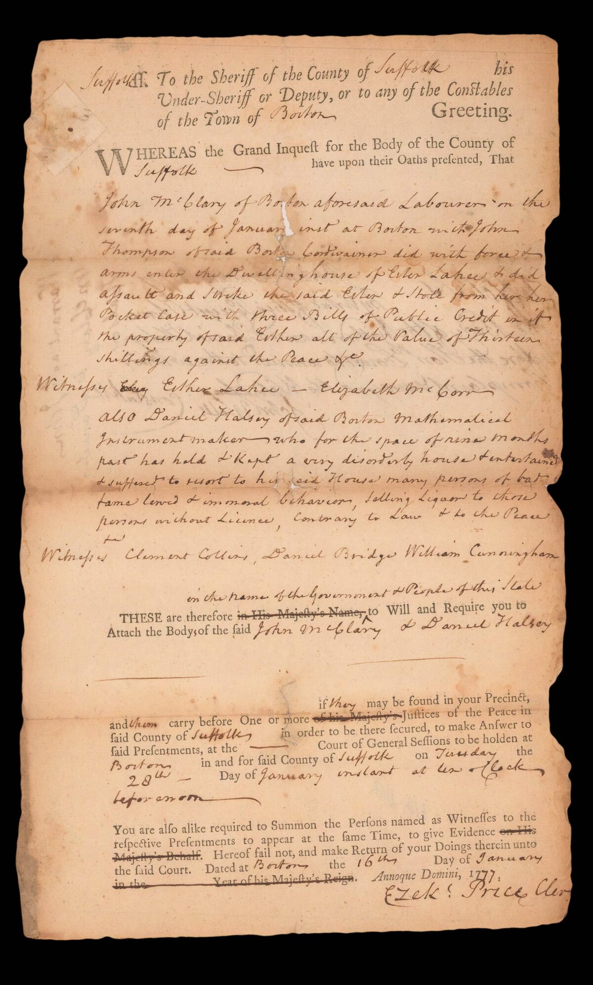 You are also alike required to Summon the Persons named as Witnesses to the respective Presentments to appear at the same Time, to give Evidence [on His Majesty's Behalf]. Hereof fail not, and make Return of your Doings therein unto the said Court. Dated at "Boston" the "16th" Day of "January" [in the Year ___ of his Majesty's Reign]. Annoque Domini 17"77": Ezek.l Price Cler[ic]'.