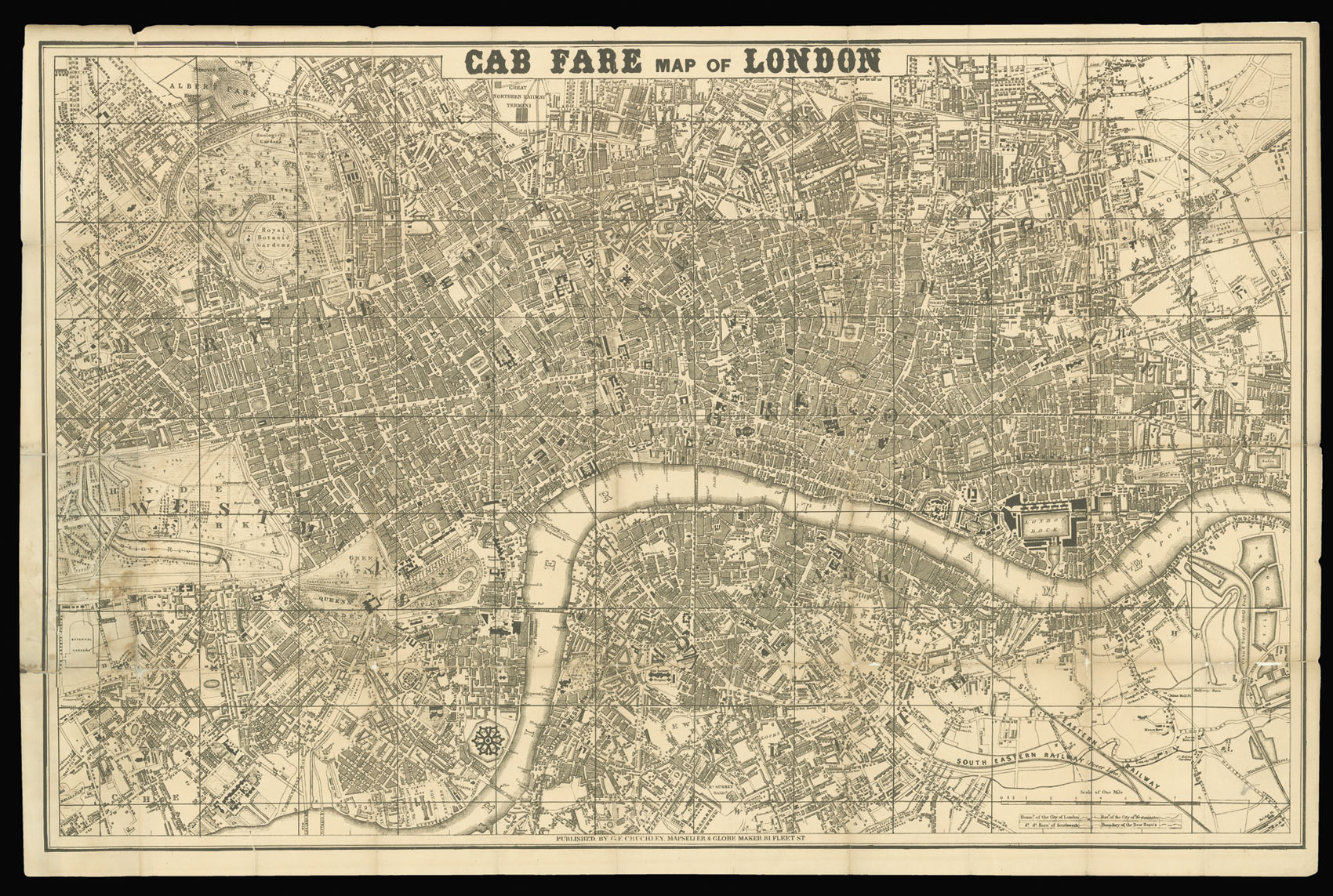 The plan is divided into half mile squares in order to easily calculate Hackney Carriage fares. Pasted into the inside cover is a 3pp. guide to using A London Cab, from payment by either distance and time; the addition costs of extra passengers; luggage; penalties for being over charged; charges for the cabbie's waiting time; and lost property.