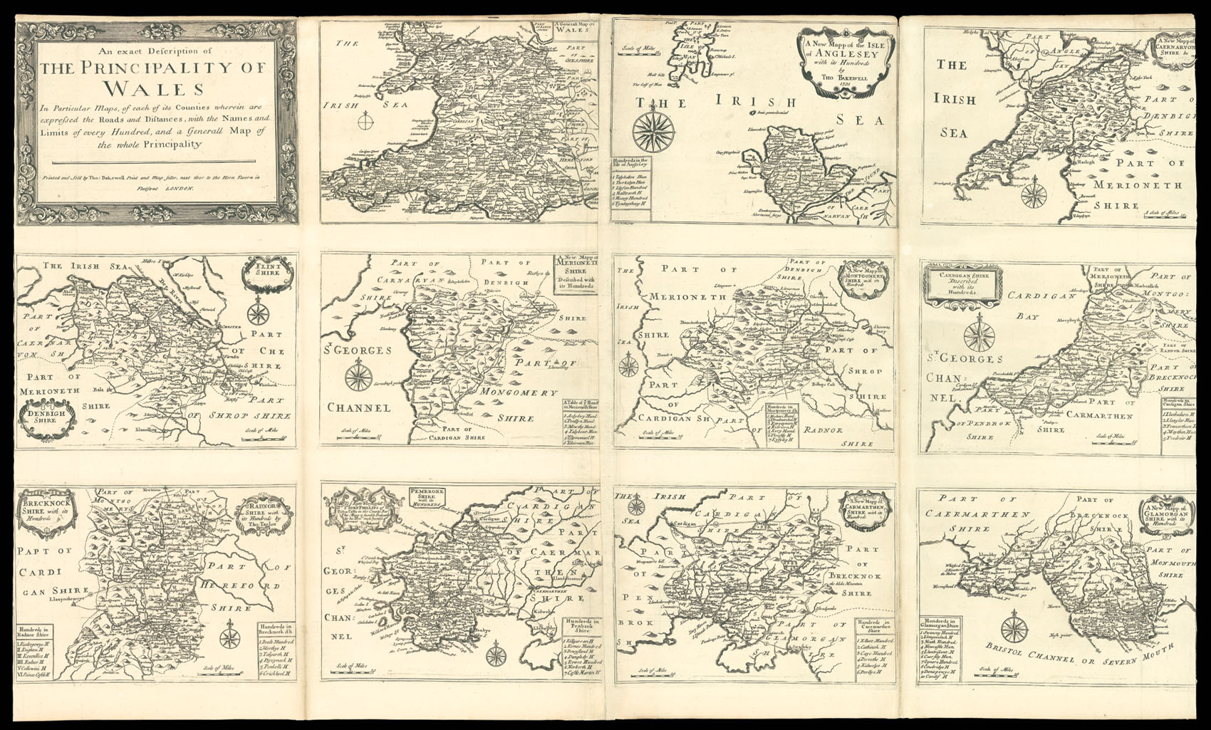 The atlas, printed here on two sheets joined, consists of an engraved title upper left, followed by 13 maps of Wales and her counties on 11 plates. Bakewell's atlas is based upon Thomas Taylor's atlas 'The Principality of Wales...' published in 1718, whose stock and shop had been acquired by Bakewell's predecessor Timothy Jordan in 1729. Nine of the plates are from Taylor's atlas, with his imprint having been crud...