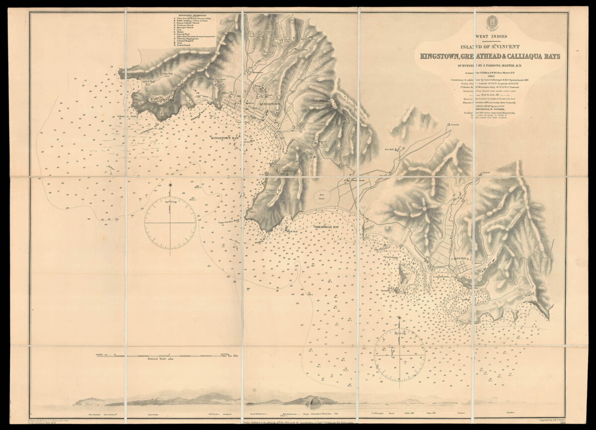 This chart shows the southern coast of the Caribbean island of St. Vincent, which was a British colony until 1979. From west to east it covers the coastline between Kingstown and Calliaqua. Fort Charlotte, a British colonial Fort built in 1763, is prominently situated on the cliffs west of Kingstown, and bears a red and yellow mark to most likely denote a light house. In Kingstown civil institutions like churches, a market and a colonial hospital are named as well as governmental and military places, the Government House and an observation point at the shore. Besides its civil aspects the map points out geographical aspects like mountains and main roads. The chart also includes soundings, anchorages, compass roses, and other signs of the sea. Below the chart is