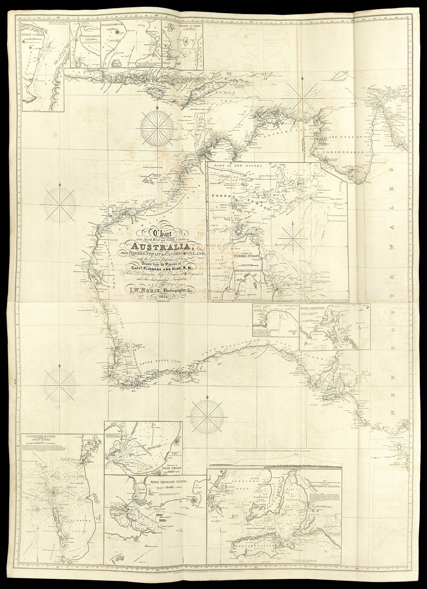 38) "Chart of the North, West and South, Coasts of Australia. from Torres Strait to Van Dieman's Land, with the Eastern Passages to China; Drawn from the Surveys of Capts. Flinders and King, R.N. Adml. D'Entrecasteau [sic.], Capts. Baudin, and Freycinet, and other distinguished Navigators." 1834, with additions to 1839. Two large folding sheets, unjoined. 12 insets.