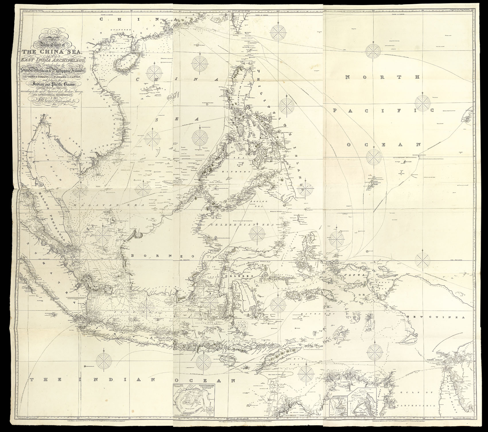 24) "A New Chart of the China Sea, and East India Archipelago, comprehending the Sunda, Molucca & Phillipine Islands... A new edition". 1821, with additions to 1839. Folding map, printed on six sheets joined, to form three large unjoined sheets. The first sheet with a manuscript addition showing the track of a ship down the Malacca Straits to an point to the north west of Malacca, with date notations starting the 26th December 1847.