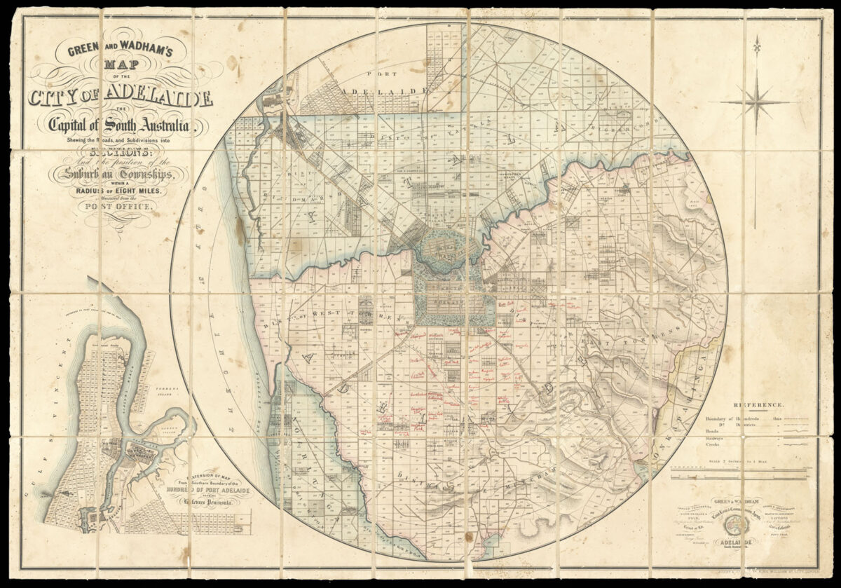 Rare cadastral map of the City of Adelaide and surrounding metropolitan area within a radius of eight miles. Includes municipal council districts names and boundaries, section numbers and main roads, railways, rivers and creeks; relief shown by hachures; and parklands shown pictorially. To the left of the map is an extension of map from the southern boundary of the Hundred of Port, showing LeFevre's Peninsula.