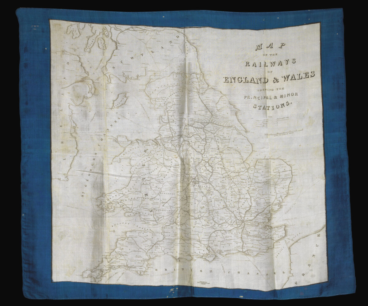 A souvenir map of England and Wales, showing the railway lines rapidly spreading across the country. Although the map is undated, the ownership embroidery ("I.W.C. 45") and the progress of the lines allows a fairly accurate estimate of the date of production. The railway line from London to Exeter is completed (1844), but not the extension to Plymouth (1846); similarly, the line to Colchester is finished (1843) but not the extension to Ipswich (1846).
