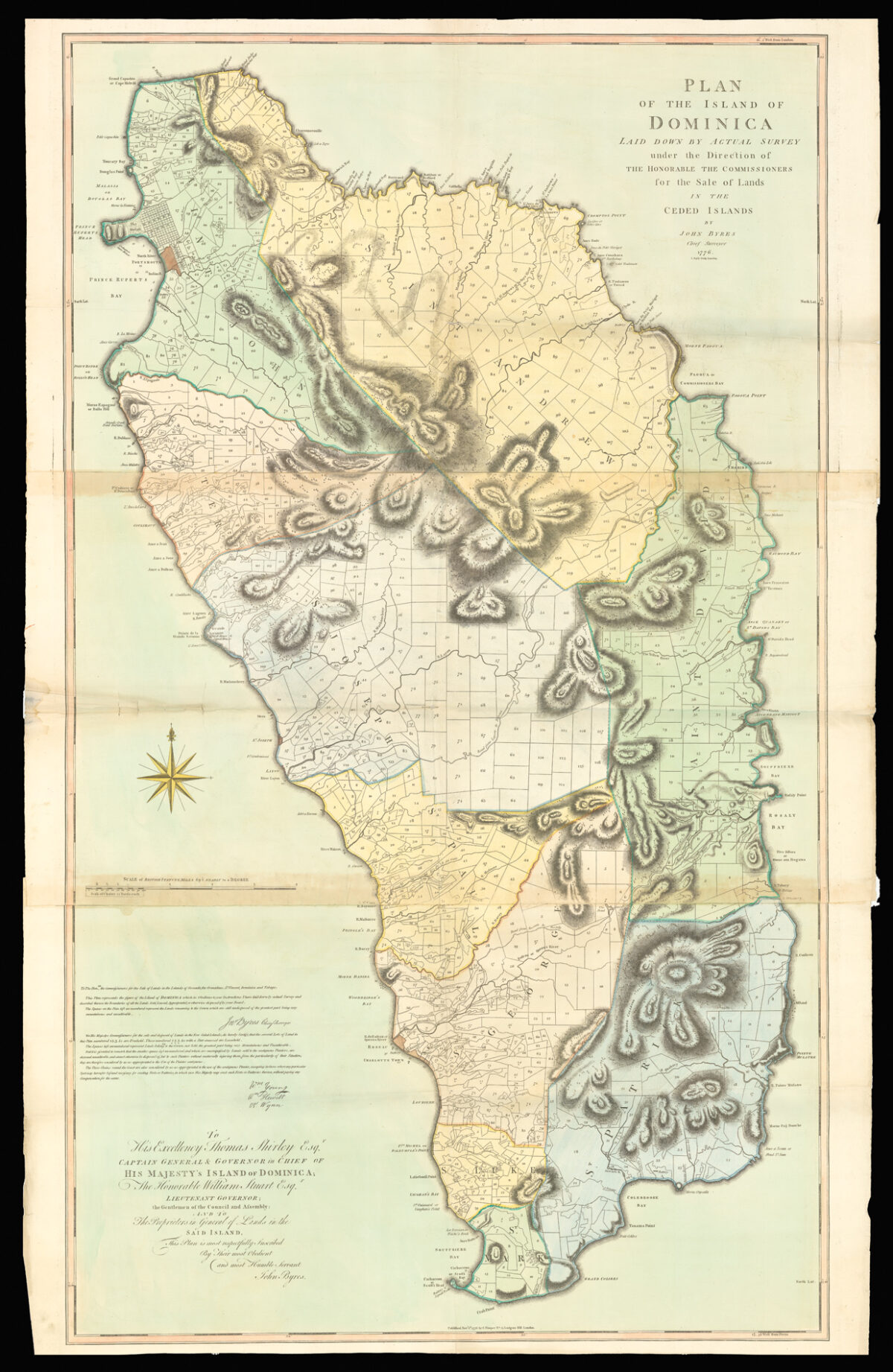 The present map, divided the island into ten parishes and subdivided each parish into numerous lots no larger than 300 acres in size. These sections covered most of Dominica except for the extremely mountainous areas in the centre of the island. Even so, very little regard was given to the lay of the land and many of the lots were on the sides of precipitous slopes and deep valleys. Most were almost impossible to get to on foot, let alone establish estates and transport goods and the majority of these lots are still inaccessible today. To accompany his map of the island published 1776, Chief surveyor John Byres compiled a list of all the properties on the island. The list, complete with alphabetical index, shows the acreage of each lot with its original or present purchaser or lessee for each parish.