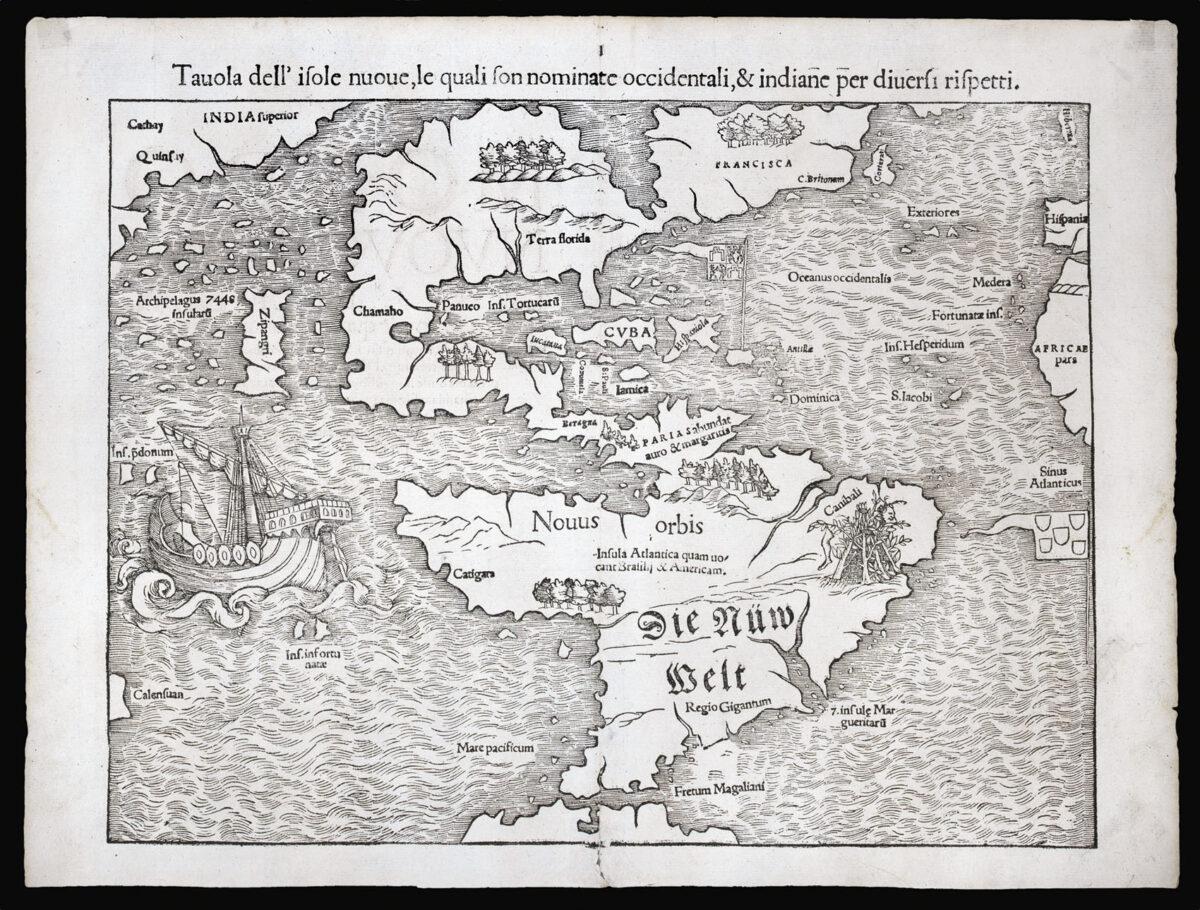 Munster first published his map of the Americas in a 1540 edition of Ptolemy's 'Geographia', and then in his own 'Cosmographia Universalis' of 1544. The present example is in the eighth state, found in the Italian edtion, first published in 1558, and then unchanged, from remaining stock, in 1571 and 1575. His depiction of North America was determined by the reports of Giovanni da Verrazano, who explored the eastern seaboard in 1524 in search of a passage to Asia. Because Verrazano mistook the Outer Banks, just off the Carolina coast, to be an isthmus separating the Atlantic Ocean from the China Sea, Münster depicted the mid-Atlantic coast of North America as a narrow isthmus, offsetting the Northeast and creating a huge sea in Canada. The origin of this error is a letter written by Verrazano during his voyage up the East Coast, dated the 8th of July, 1524: