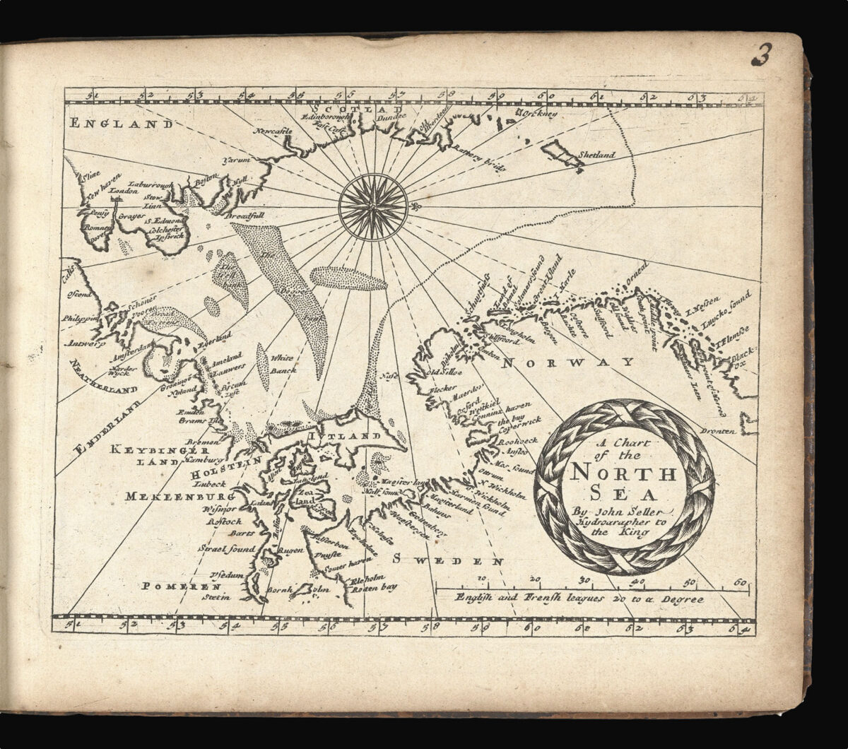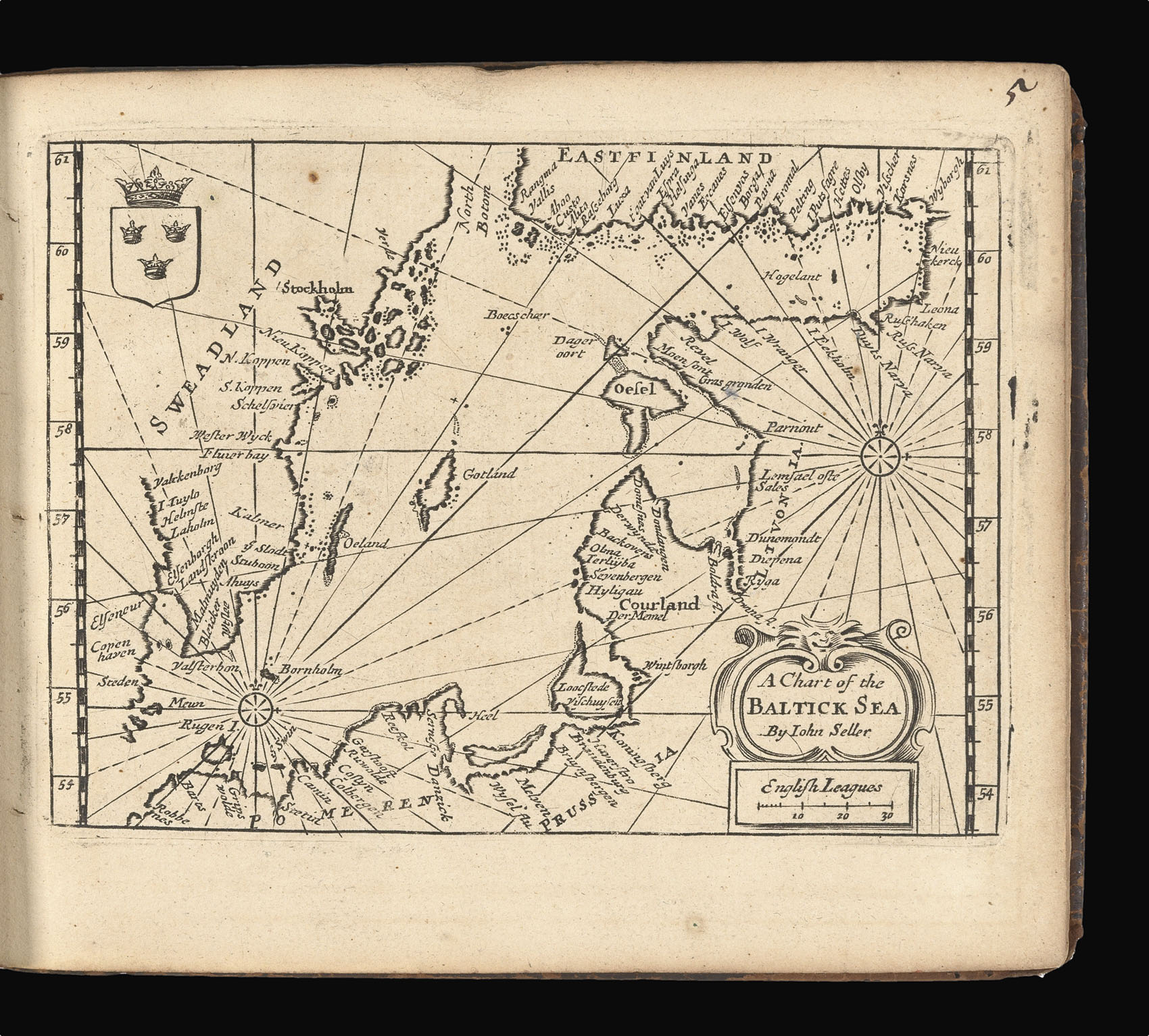 Before entering the atlas market, Seller traded in nautical instruments from his shop 'at the Sign of the Mariner's Compass' in Wapping – at the time the heart of the maritime trade. In 1669 he published 'Paxis Nautica: Practical Navigation', which established his credentials within the maritime community. His place was further strengthened when, in 1671, he was appointed hydrographer to Charles II.