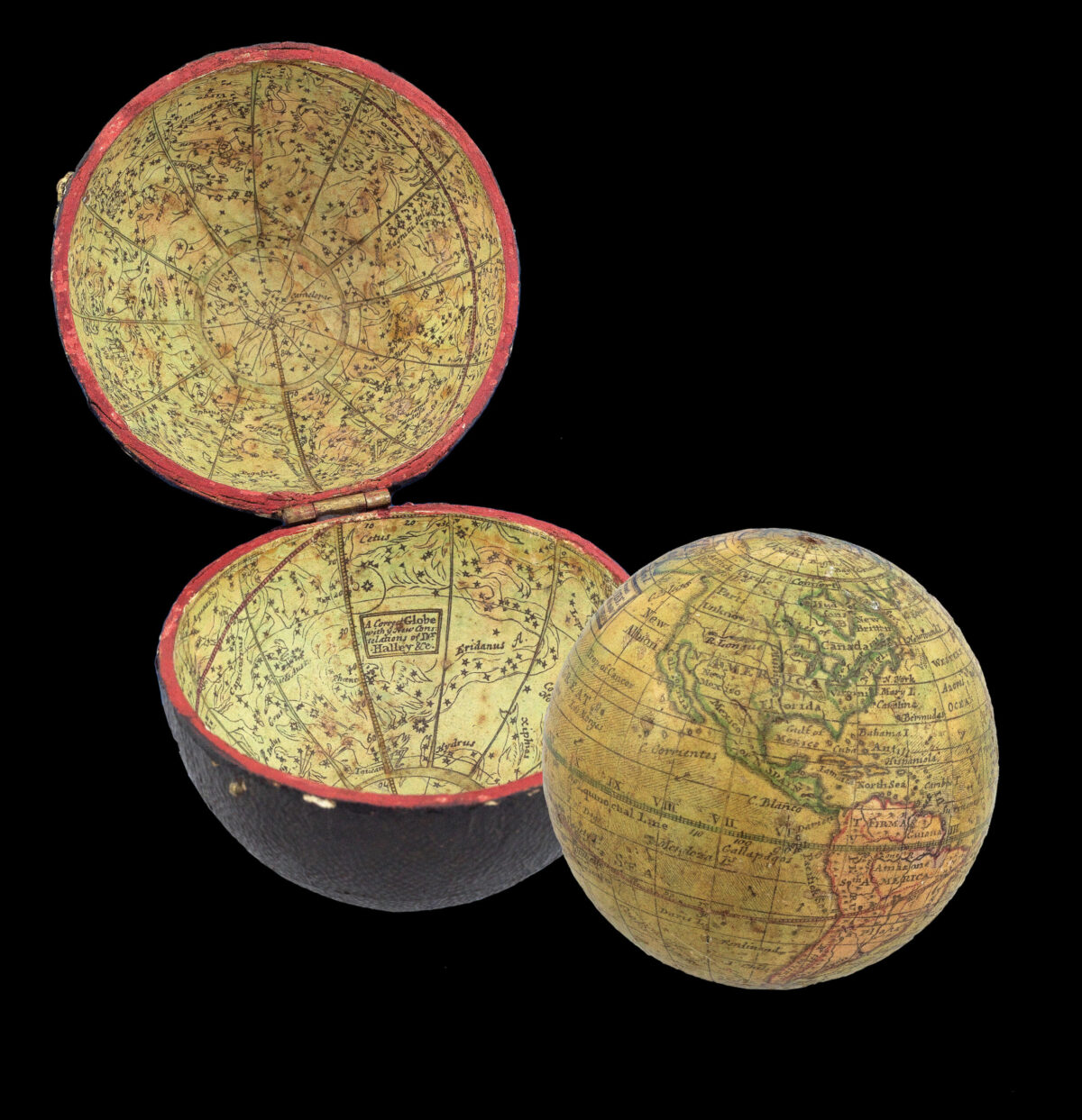 Globe, 12 hand-coloured engraved paper gores, clipped at 70 degrees latitude, with two polar calottes, over a papier mâché and plaster sphere, housed within original shagreen over paste-board clamshell case, with hooks and eyes, lined with two sets of 12 hand-coloured engraved celestial gores, clipped at 70 degrees declination, varnished. Dimensions: 70mm (2.75 inches).