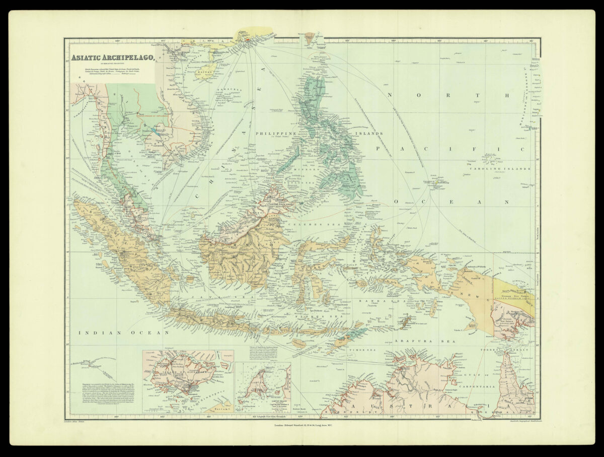 Stanford's map of the East Indies, with the various possessions of European countries in different colours.