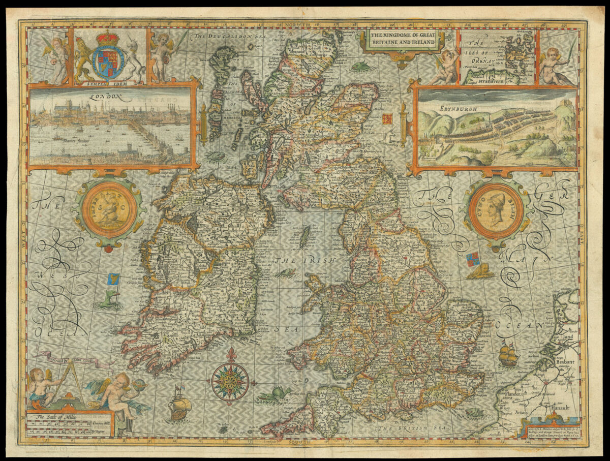A map of Great Britain and Ireland, with inset views of London and Edinburgh and a map of the Orkneys. The pendants to the views are each side of a coin issued by Cunobeline, an Ancient British king, later immortalised by William Shakespeare in his play Cymbeline, produced for the first time the year before Speed's work was published.