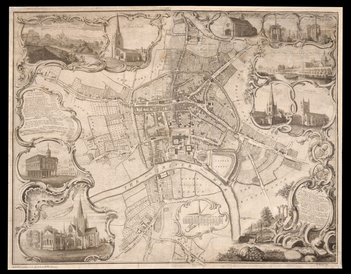 The central city-plan is surrounded by views of notable places in Hereford, framed by elaborate rococo strapwork, among them: "General View from Broomy Hill", "Crofs of the White Fryers", "The Palace Church & part of the Town", the "Town Hall", and "St Ethelbert's Cathedral". Bottom-right, the title is housed in an elaborate cartouche, accompanied by, apparently, a self-portrait of Taylor himself at work. To the left are lis...