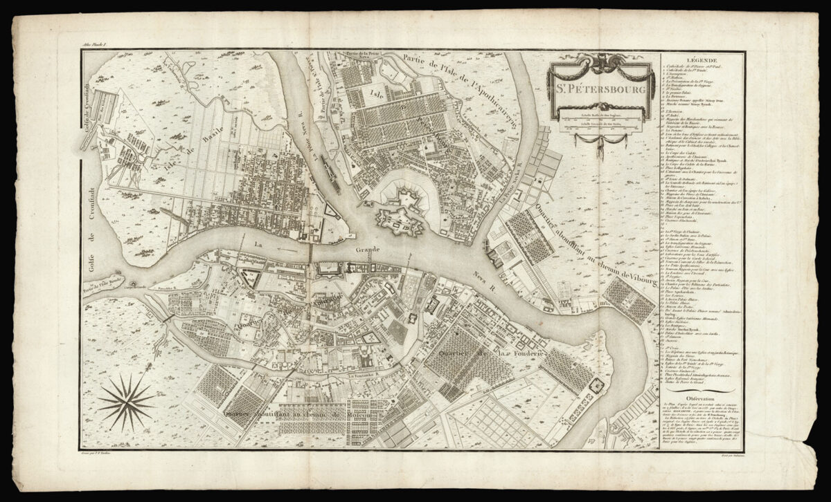 Striking plan of the City of St. Petersburg, from Le Clerc's Histoire physique, morale, civile et politique de la Russie Ancienne by N. G. Le Clerc.