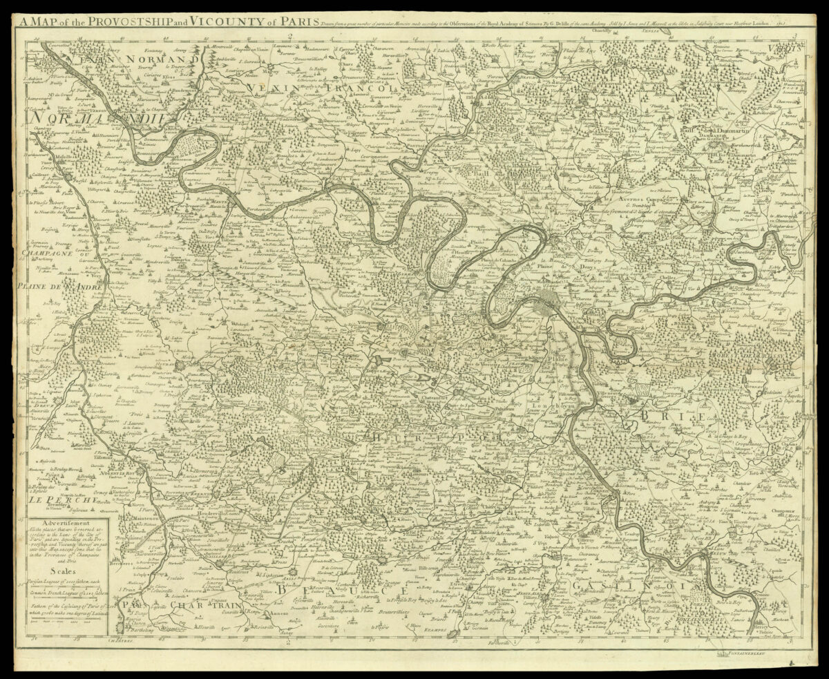 A map showing Paris and the surrounding area under its jurisdiction, based on the work of the French cartographer Guillaume Delisle (1675-1726), the leading mapmaker of his time. France and Britain had recently signed a truce after the end of the War of the Spanish Succession, sealed by the Treaty of Utrecht in 1713. France was still under the absolute rule of Louis XIV, the 'Sun King'; he would die in 1715, two years after this map was published. Visible to the left of Par...